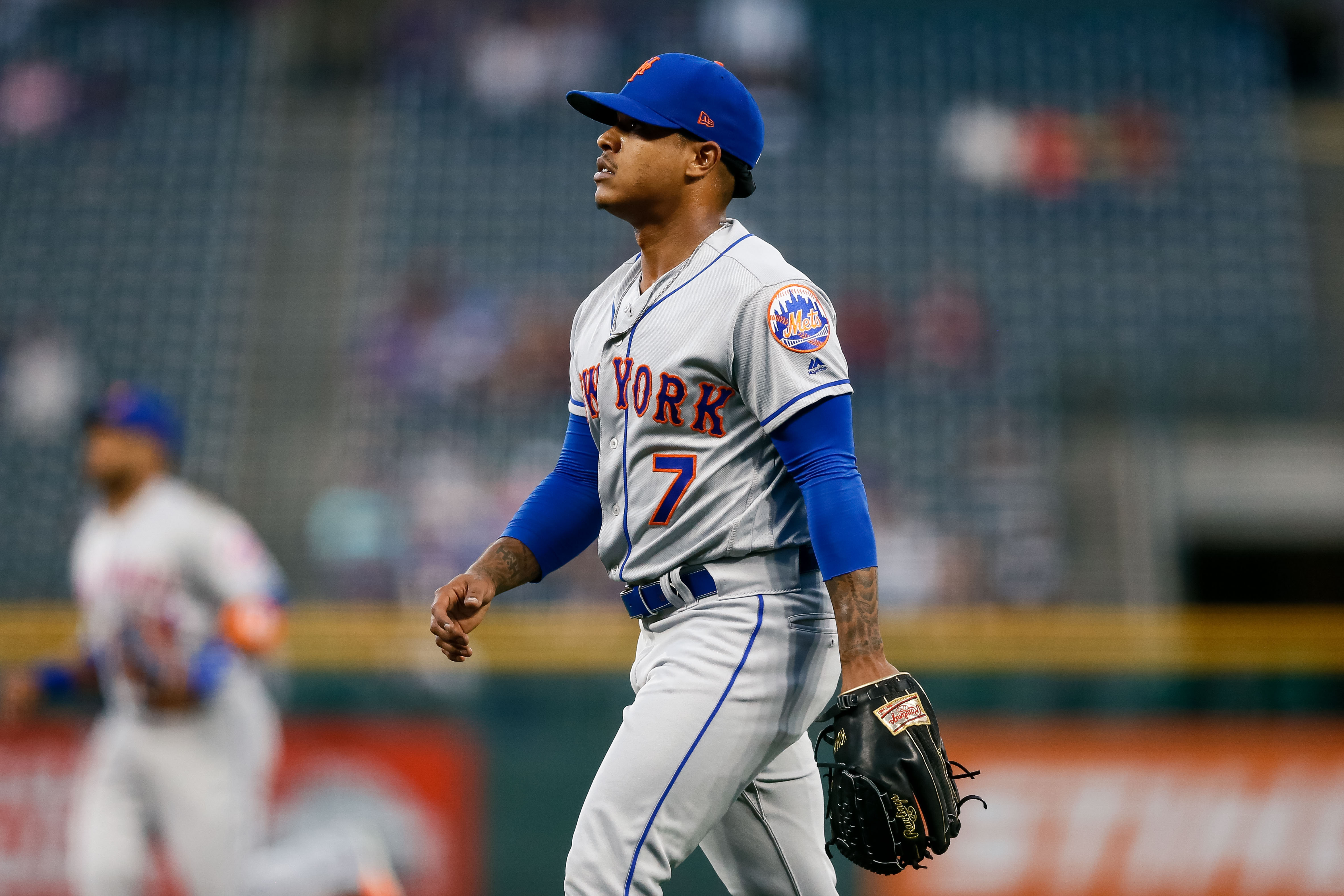 Sep 17, 2019; Denver, CO, USA; New York Mets starting pitcher Marcus Stroman (7) walks off the mound at the end of the first inning against the Colorado Rockies at Coors Field. Mandatory Credit: Isaiah J. Downing-USA TODAY Sports / Isaiah J. Downing