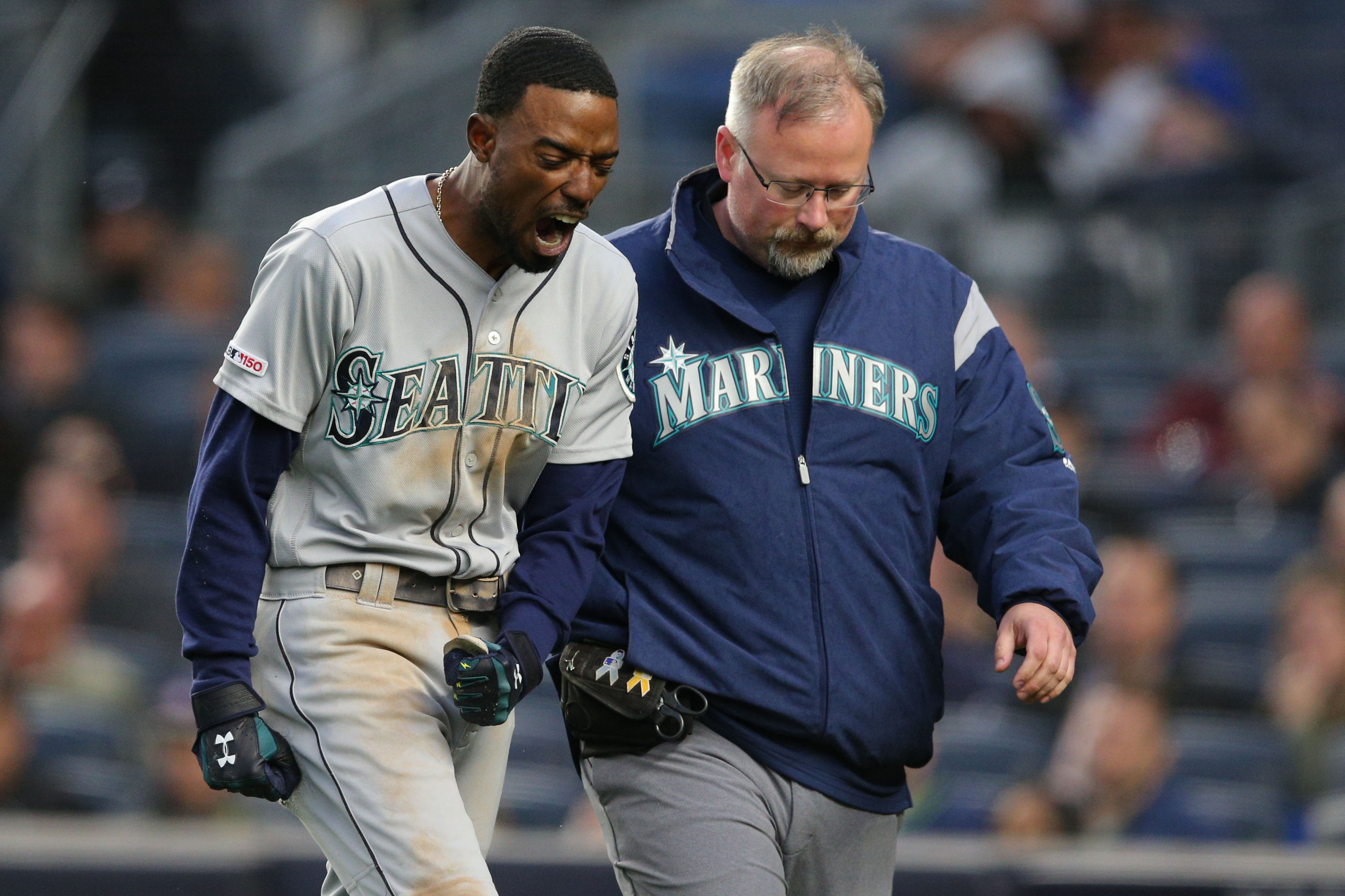 May 9, 2019; Bronx, NY, USA; Seattle Mariners second baseman Dee Gordon (9) reacts while walking off the field with trainer after getting hit by a pitch during the third inning against the New York Yankees at Yankee Stadium. Mandatory Credit: Brad Penner-USA TODAY Sports / Brad Penner