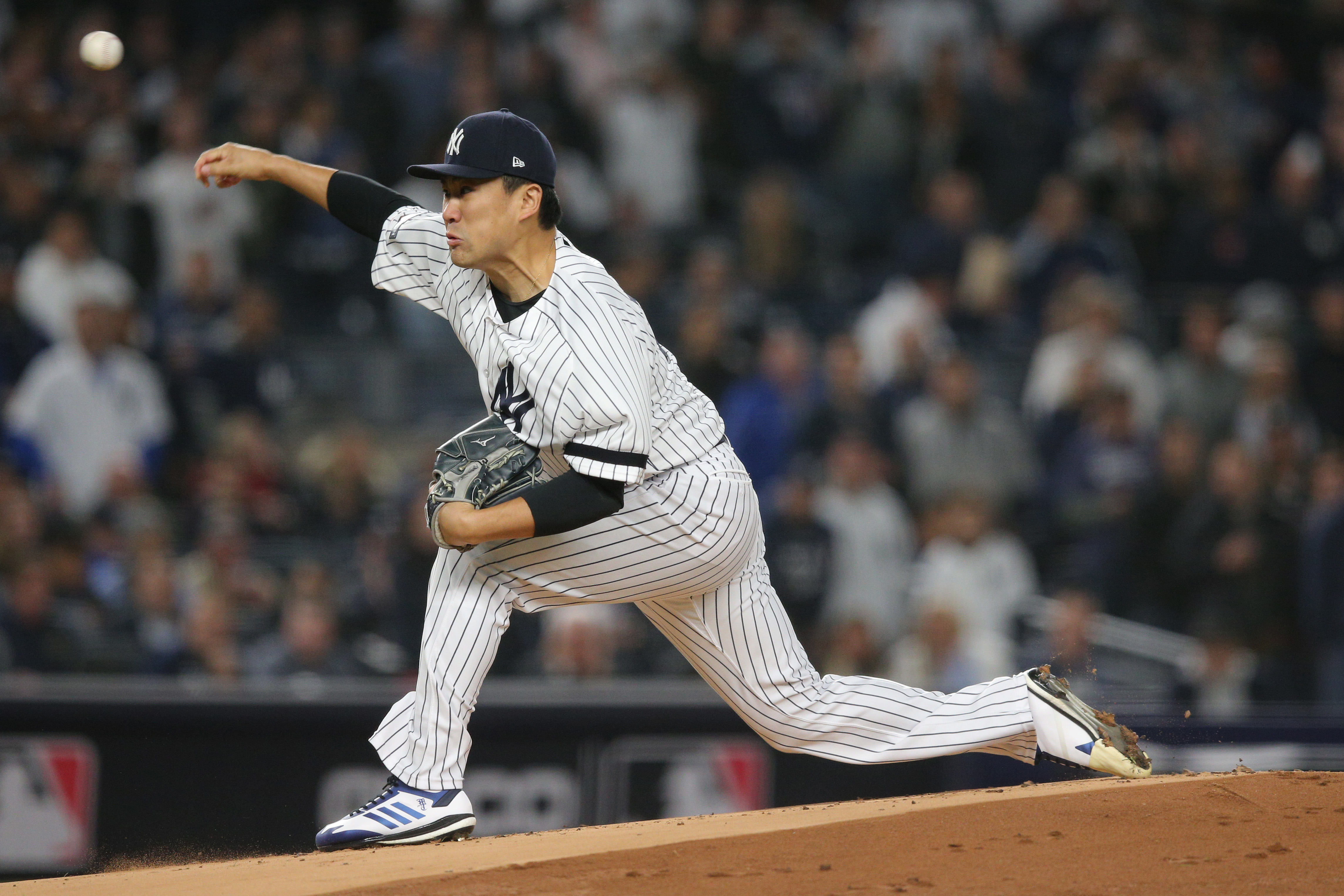 Oct 17, 2019; Bronx, NY, USA; New York Yankees starting pitcher Masahiro Tanaka (19) throws against the Houston Astros in game four of the 2019 ALCS playoff baseball series at Yankee Stadium. Mandatory Credit: Brad Penner-USA TODAY Sports / Brad Penner