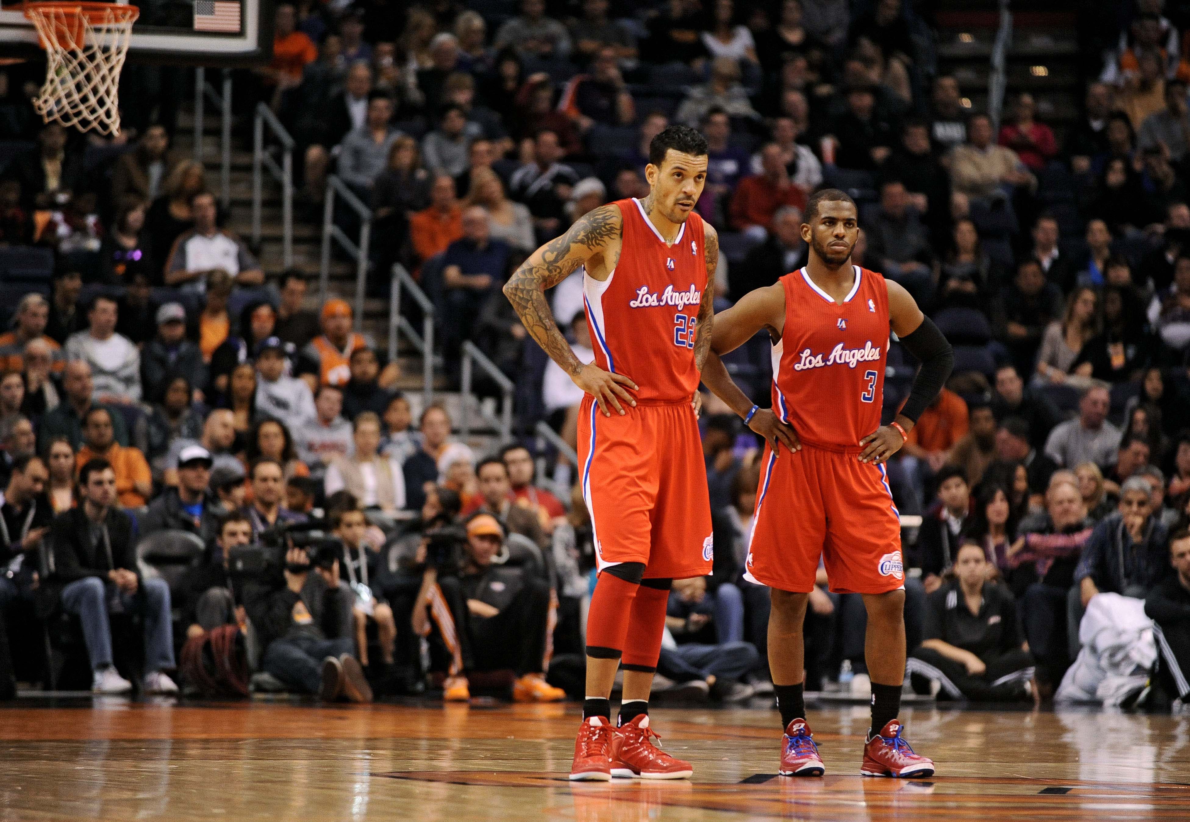 Dec. 23, 2012; Phoenix, AZ, USA; Los Angeles Clippers forward Matt Barnes (22) and guard Chris Paul (3) stand on the court during the game against the Phoenix Suns at US Airways Center. / © Jennifer Stewart-USA TODAY Sports
