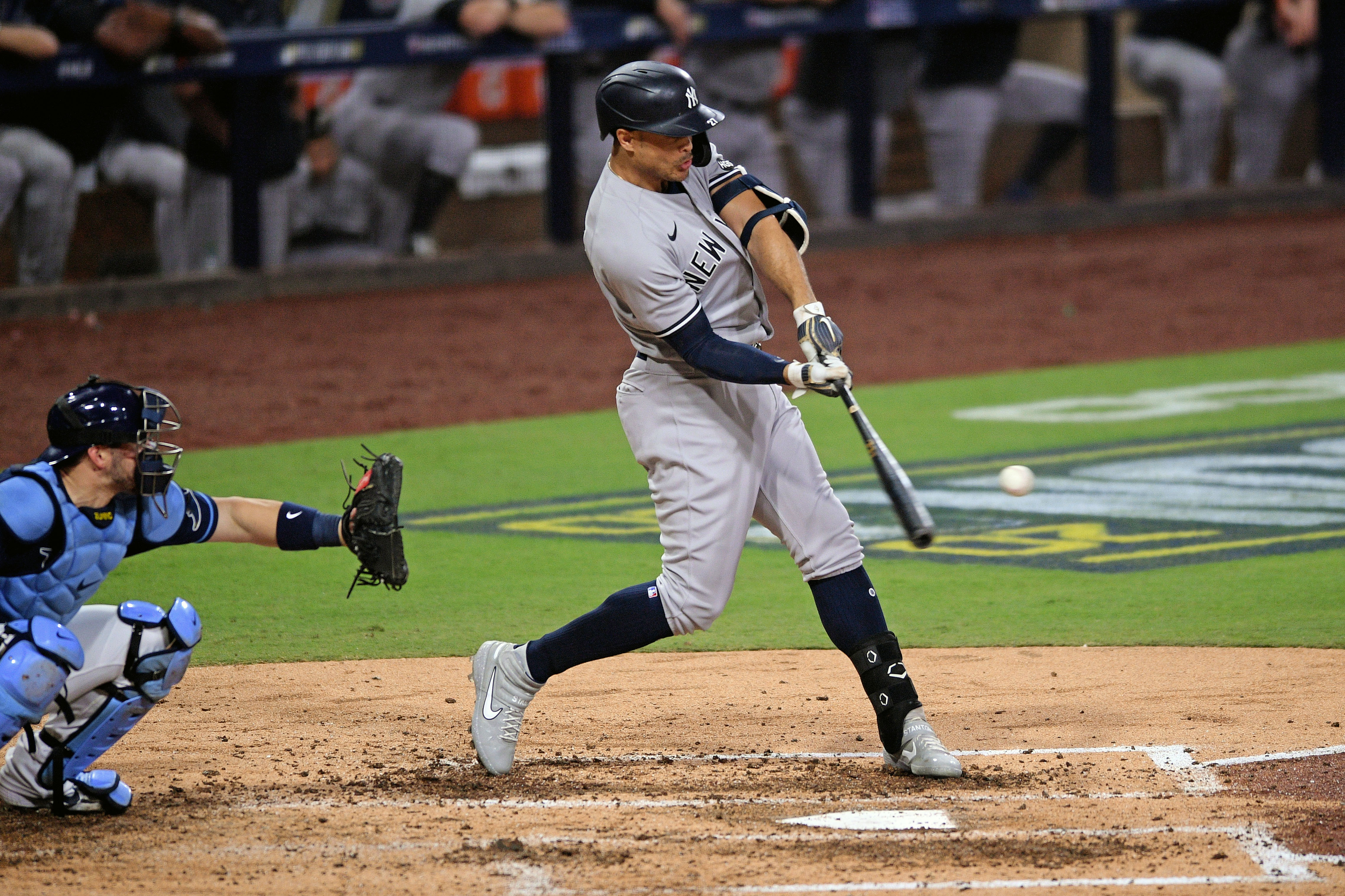 Oct 6, 2020; San Diego, California, USA; New York Yankees designated hitter Giancarlo Stanton (27) connects for a three-run homerun in the 4th inning against the Tampa Bay Rays during game two of the 2020 ALDS at Petco Park. / Orlando Ramirez-USA TODAY Sports