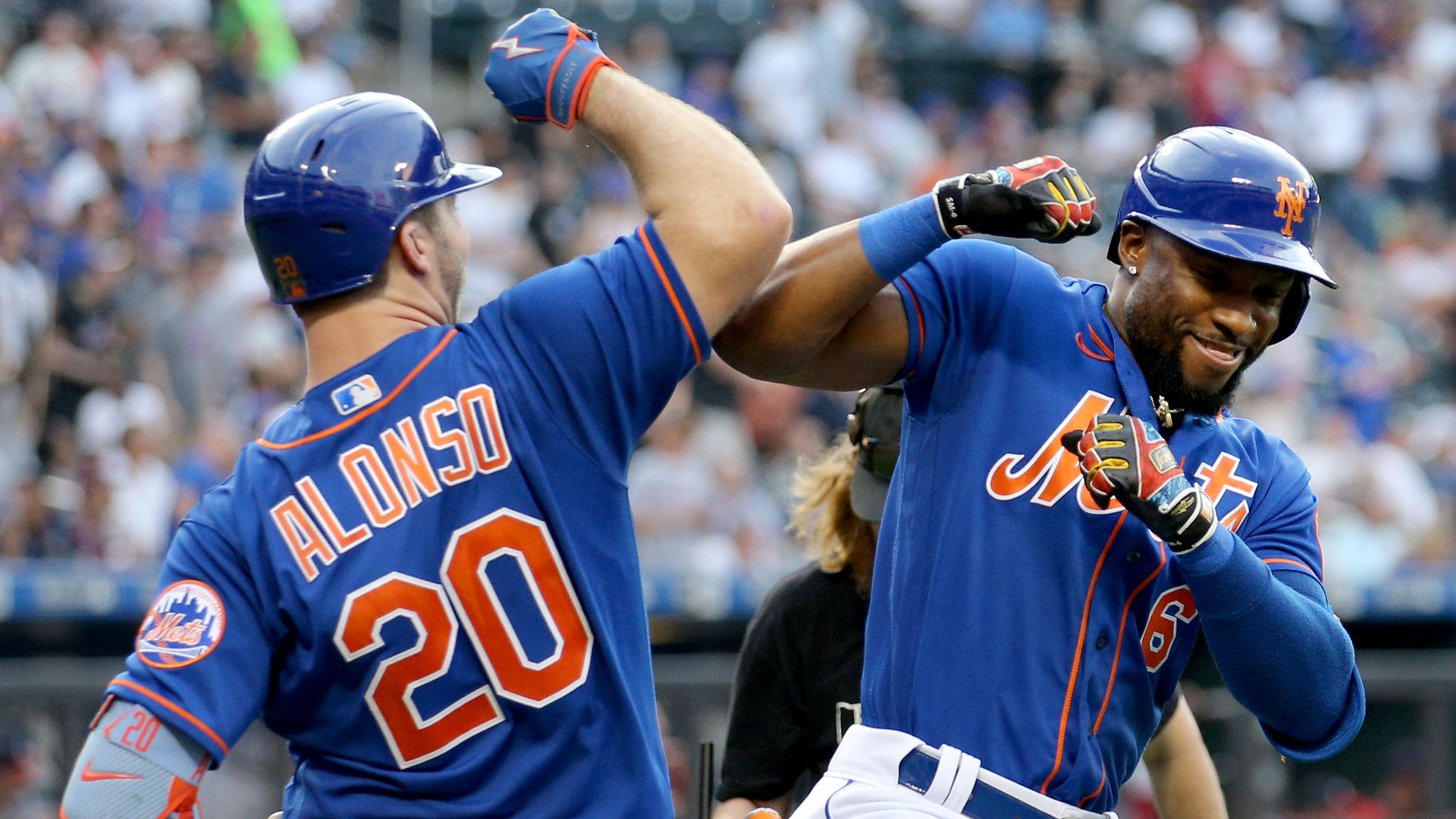 May 31, 2022; New York City, New York, USA; New York Mets right fielder Starling Marte (6) celebrates his two run home run against the Washington Nationals with first baseman Pete Alonso (20) during the first inning at Citi Field. / Brad Penner-USA TODAY Sports