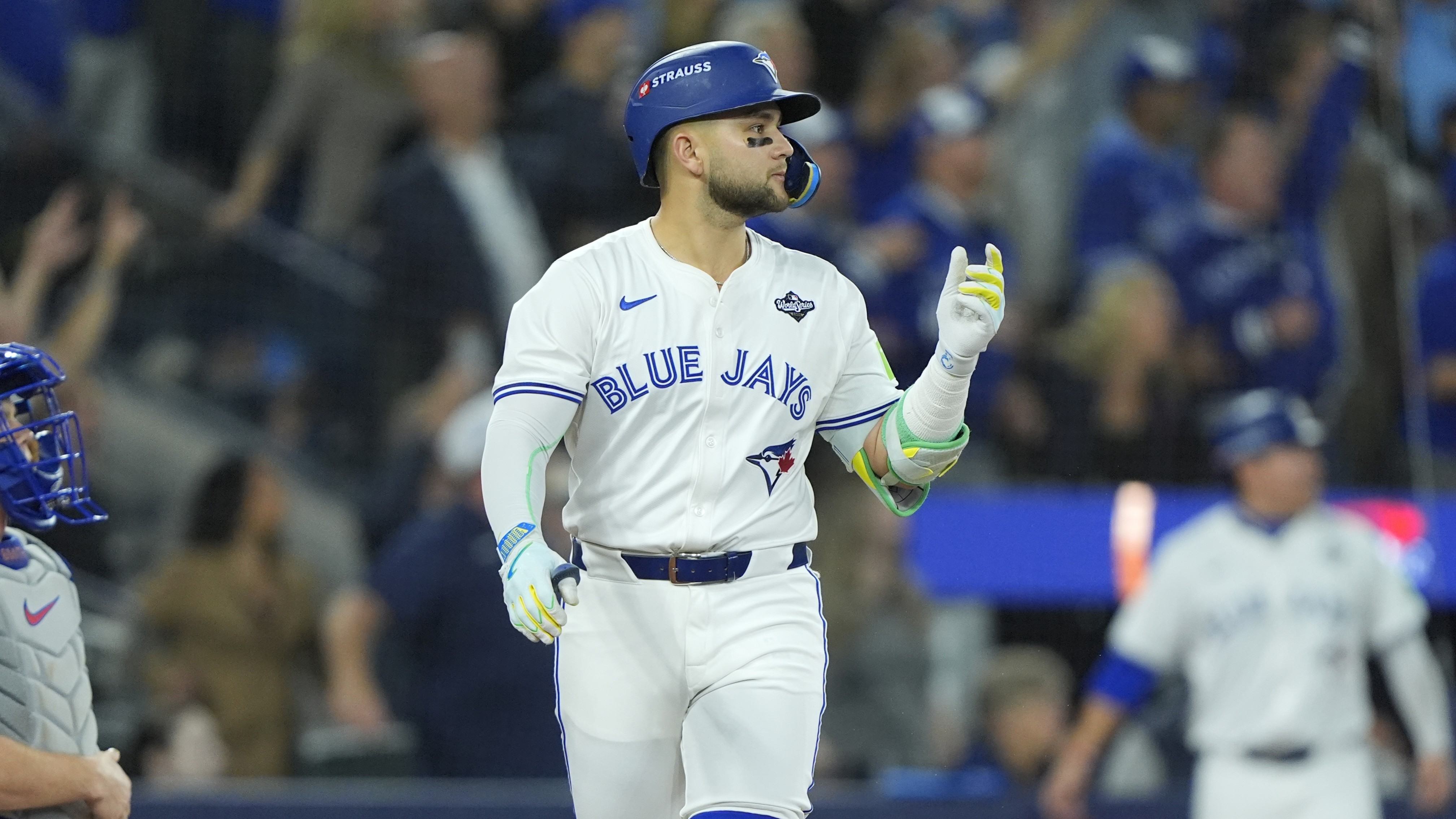 Oct 13, 2025; Toronto, Ontario, CAN; Seattle Mariners infielder Jorge Polanco (7) throws to first base for the first out in the third inning against the Toronto Blue Jays during game two of the ALCS round for the 2025 MLB playoffs at Rogers Centre. / Nick Turchiaro-Imagn Images