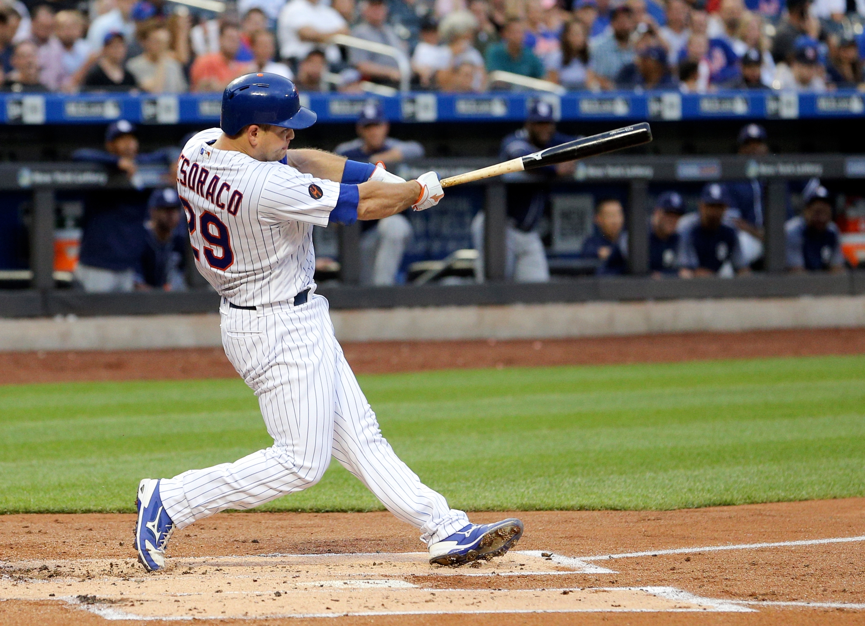 Jul 24, 2018; New York City, NY, USA; New York Mets catcher Devin Mesoraco (29) hits a three-run double against the San Diego Padres during the first inning at Citi Field. Mandatory Credit: Brad Penner-USA TODAY Sports / Brad Penner