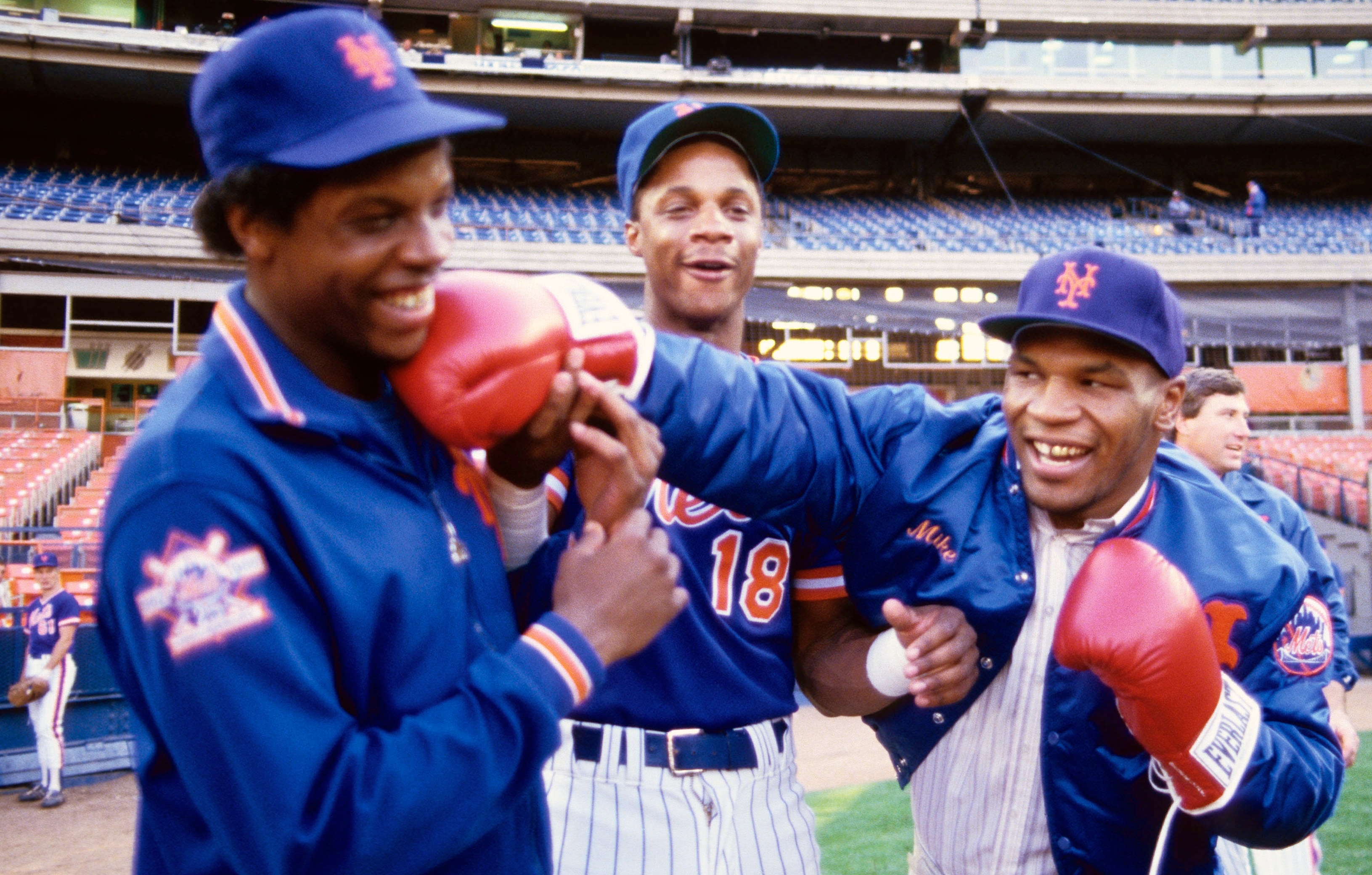 Dwight Gooden and right fielder Darryl Strawberry (18) joke around on the field with boxer Mike Tyson before a game at Shea Stadium. Mandatory Credit: Tony Tomsic-USA TODAY NETWORK / Tony Tomsic