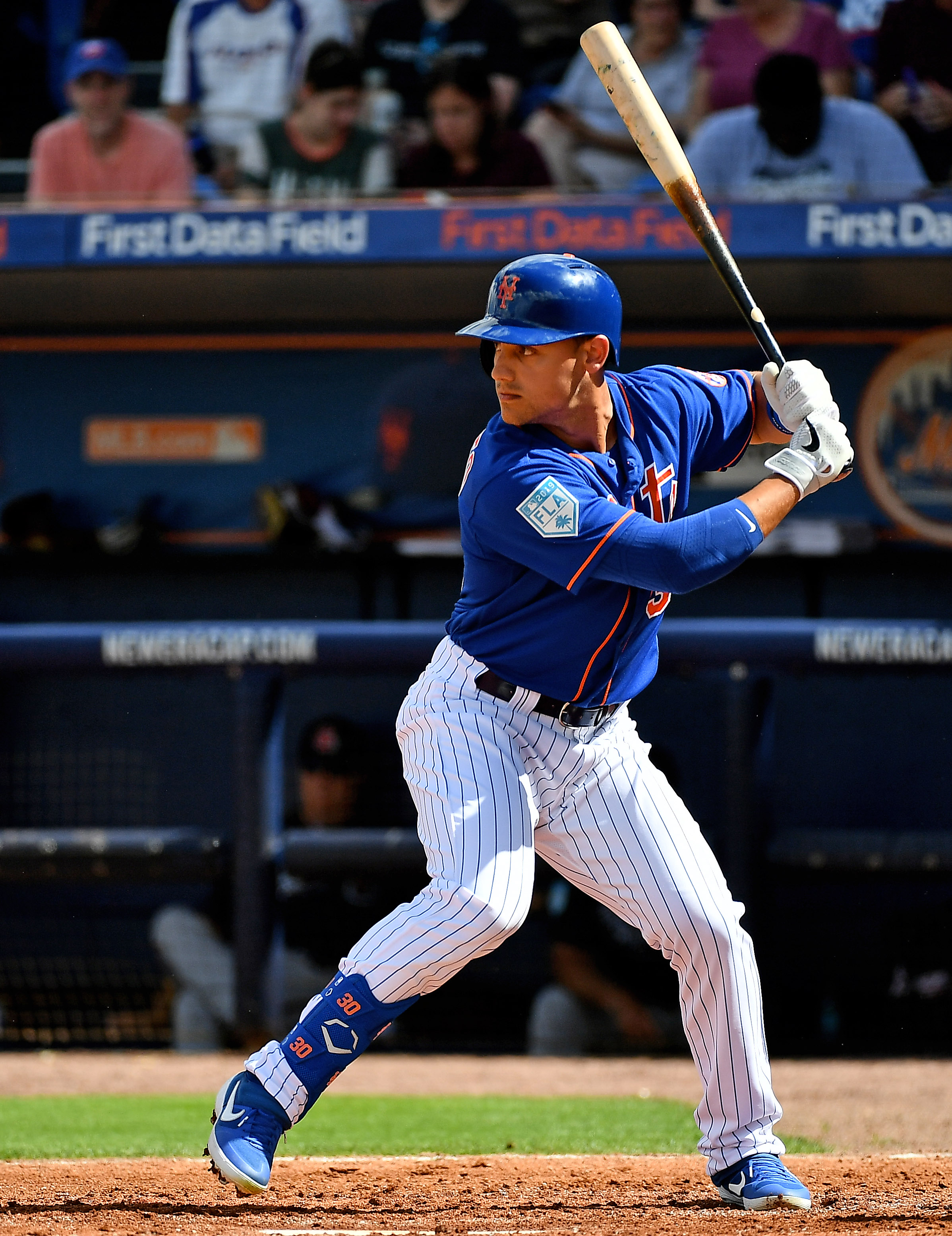 Feb 23, 2019; Port St. Lucie, FL, USA; New York Mets right fielder Michael Conforto (30) at bat in the second inning against the Atlanta Braves at First Data Field. Mandatory Credit: Jasen Vinlove-USA TODAY Sports / Jasen Vinlove