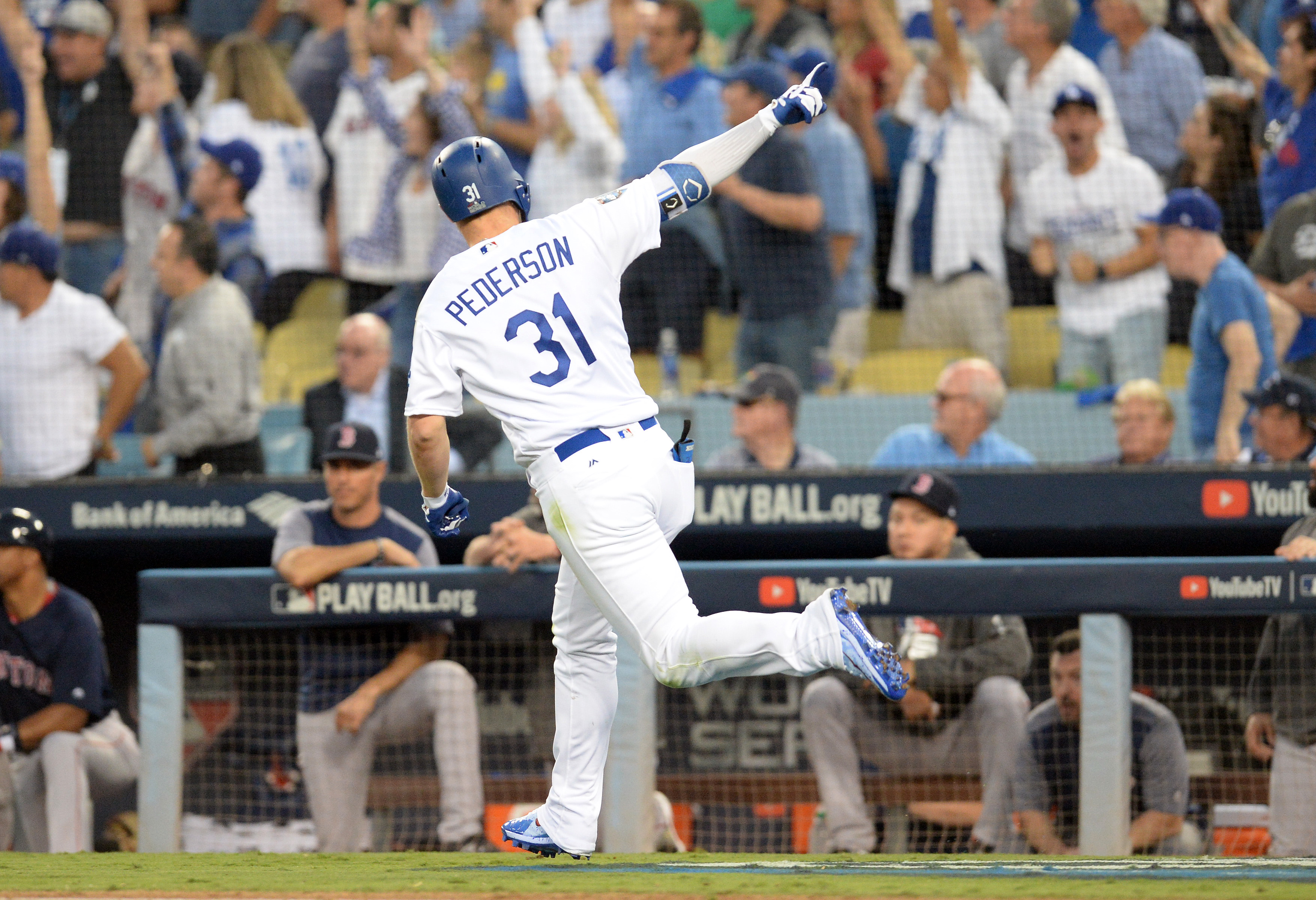 Oct 26, 2018; Los Angeles, CA, USA; Los Angeles Dodgers outfielder Joc Pederson (31) celebrates after hitting a solo home run against the Boston Red Sox in the third inning in game three of the 2018 World Series at Dodger Stadium. Mandatory Credit: Gary A. Vasquez-USA TODAY Sports / Gary A. Vasquez