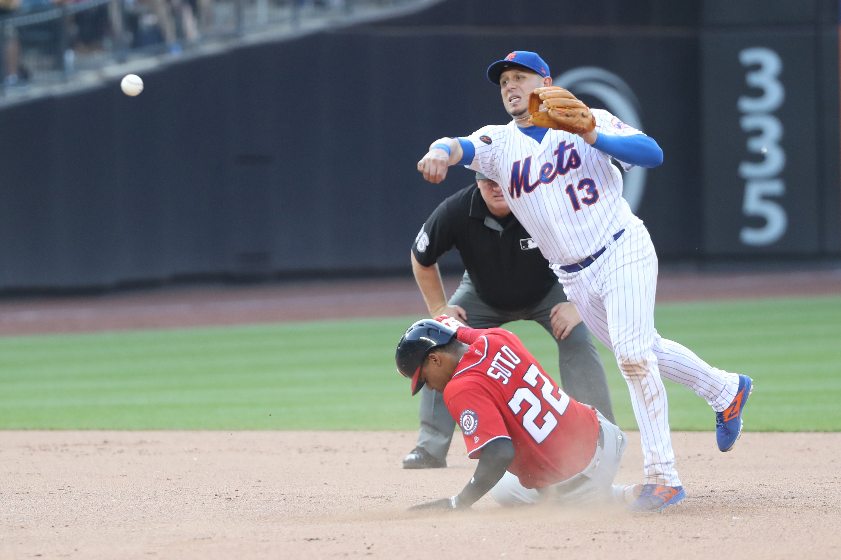 Jul 14, 2018; New York City, NY, USA; New York Mets second baseman Asdrubal Cabrera (13) has Washington Nationals right fielder Juan Soto (22) out but fails to complete the double play during the eighth inning at Citi Field. Mandatory Credit: Anthony Gruppuso-USA TODAY Sports / Anthony Gruppuso