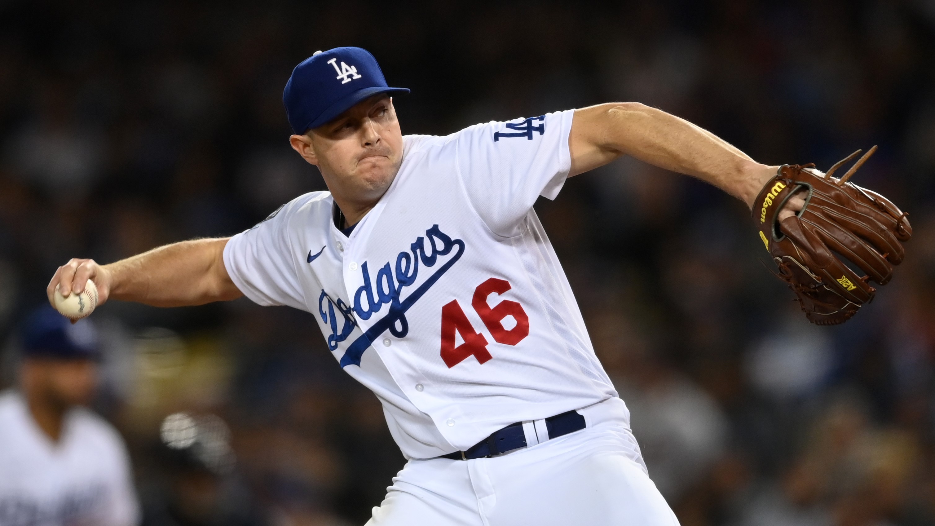 Oct 21, 2021; Los Angeles, California, USA; Los Angeles Dodgers relief pitcher Corey Knebel (46) pitches in the eighth inning against the Atlanta Braves during game five of the 2021 NLCS at Dodger Stadium. / Jayne Kamin-Oncea-USA TODAY Sports