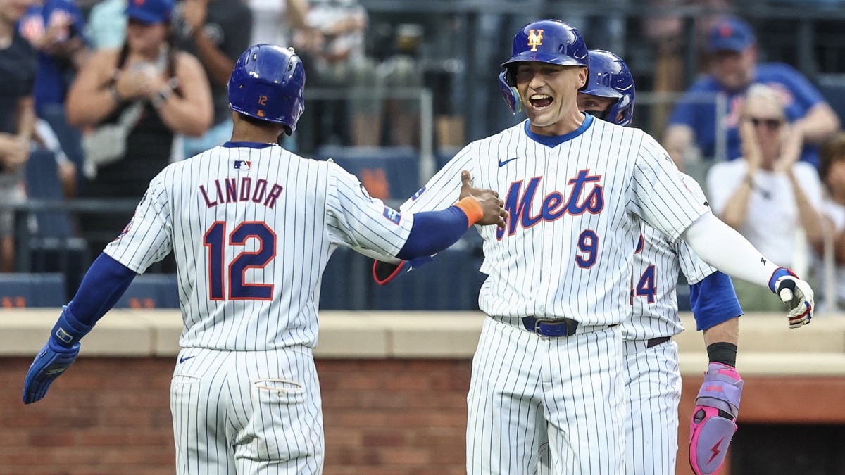 Sep 22, 2024; New York City, New York, USA; New York Mets first baseman Pete Alonso (20) arm bumps New York Mets left fielder Brandon Nimmo (9) for hitting a home run against the Philadelphia Phillies during the sixth inning at Citi Field. / Gregory Fisher-Imagn Images