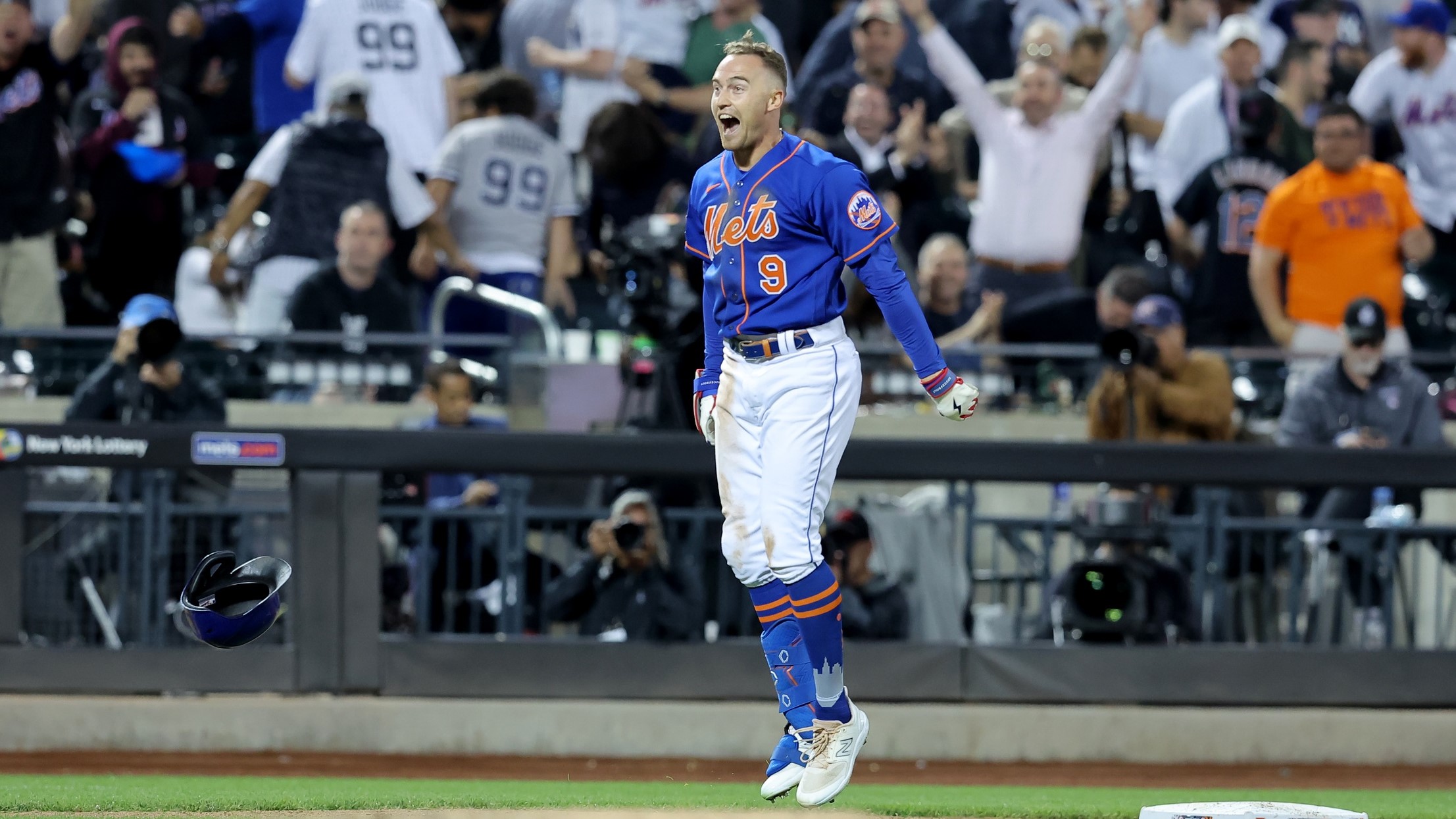 Jun 14, 2023; New York City, New York, USA; New York Mets center fielder Brandon Nimmo (9) celebrates with shortstop Francisco Lindor (12) after hitting a tenth inning walkoff double against the New York Yankees at Citi Field. / Brad Penner-USA TODAY Sports