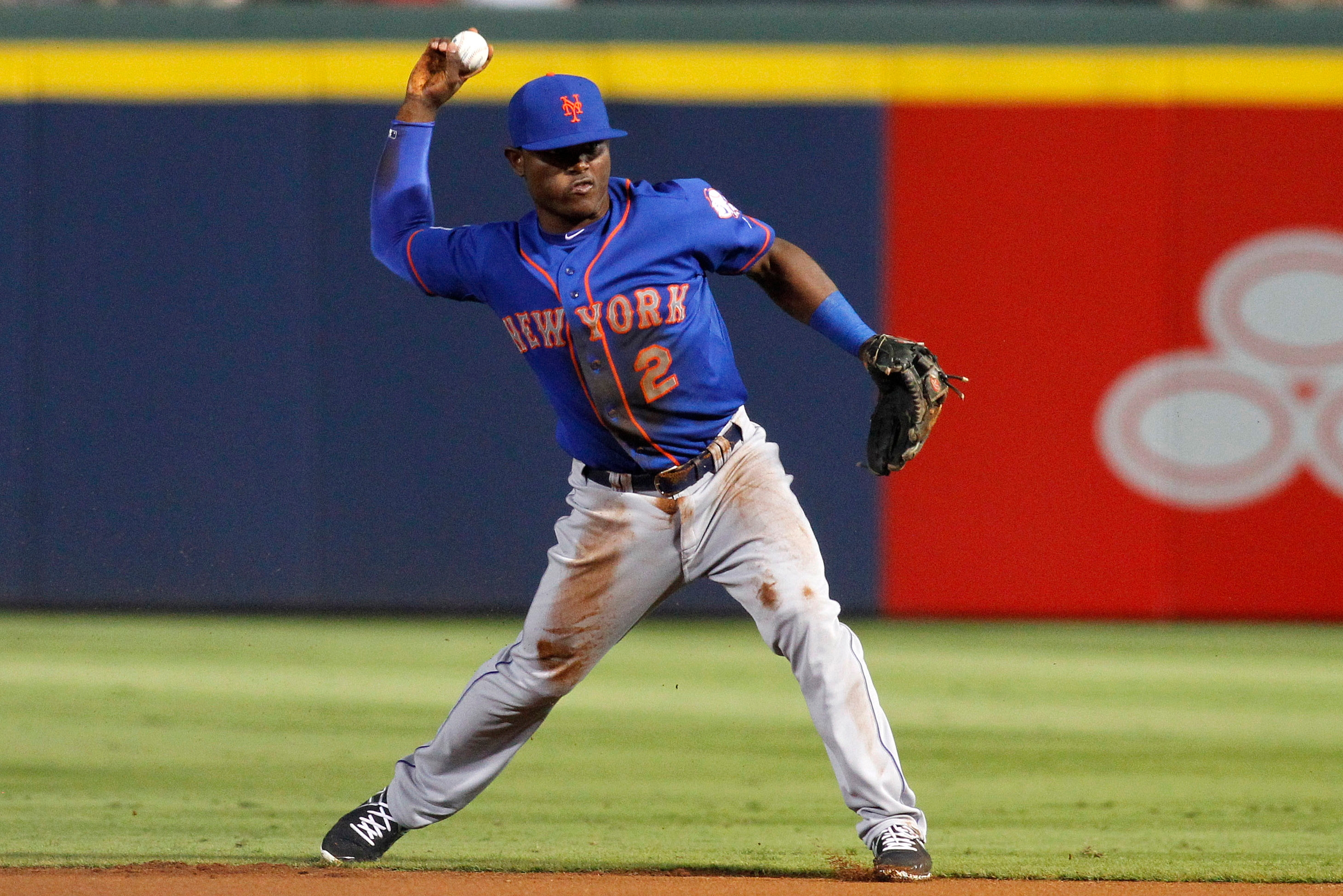 New York Mets second baseman Dilson Herrera (2) throws a runner out at first against the Atlanta Braves in the first inning at Turner Field. / Brett Davis