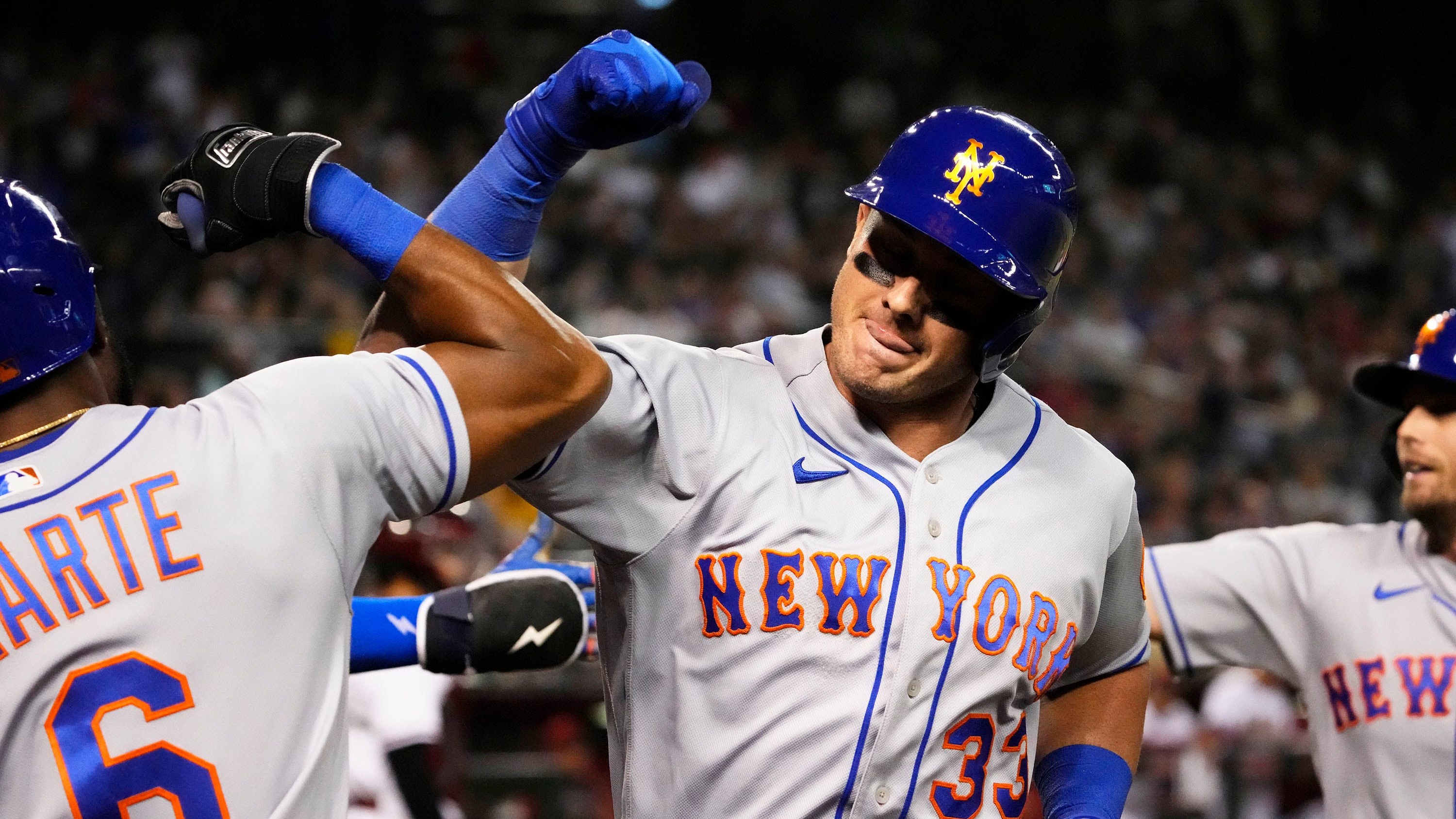 Apr 22, 2022; Phoenix, Arizona, USA; New York Mets James McCann (33) reacts after hitting a two-run home run against the Arizona Diamondbacks in the seventh inning at Chase Field. / Rob Schumacher-Arizona Republic Mlb New York Mets At Arizona Diamondbacks