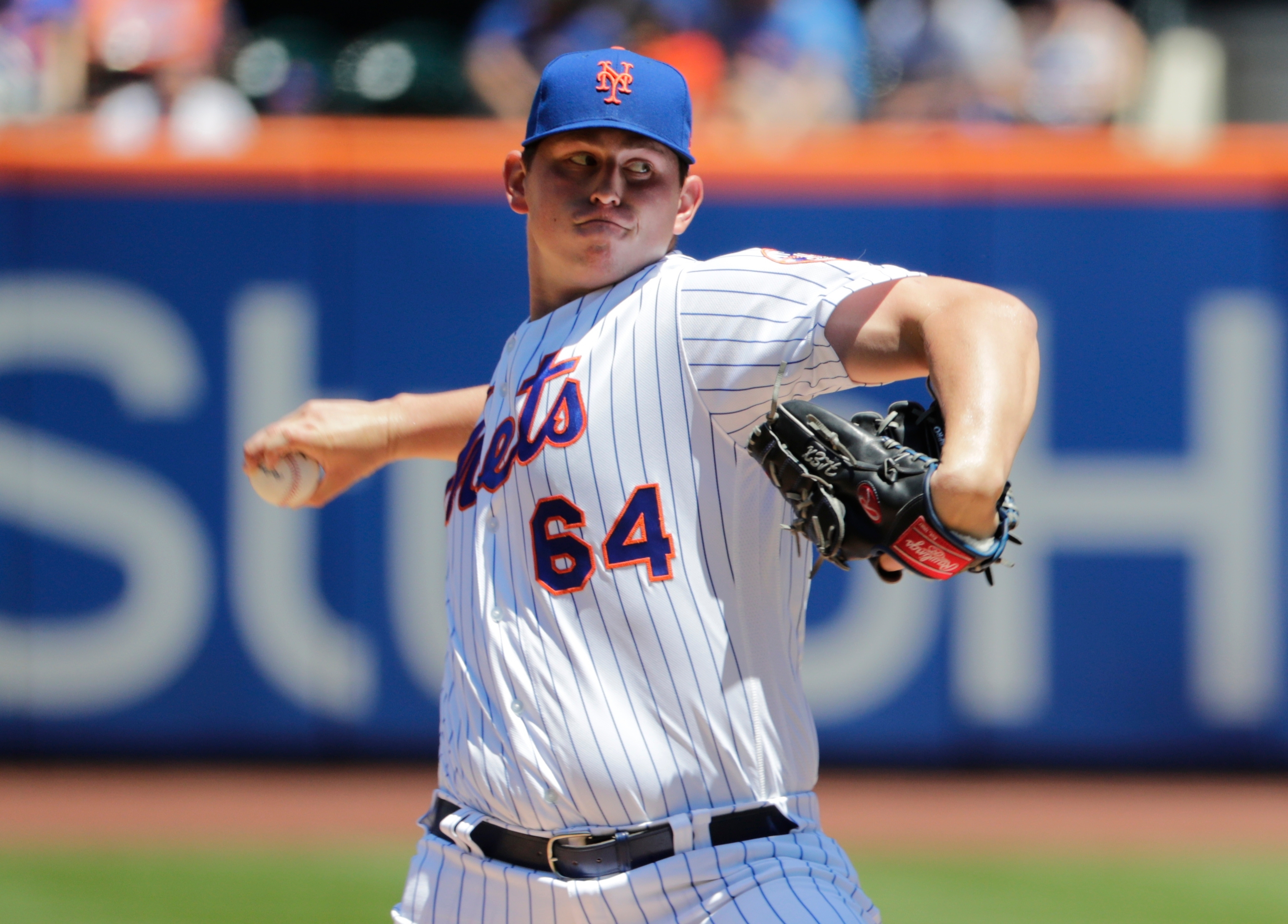 New York Mets' Chris Flexen (64) delivers a pitch during the first inning of a baseball game against the Tampa Bay Rays Sunday, July 8, 2018, in New York. (AP Photo/Frank Franklin II) / Frank Franklin II/AP