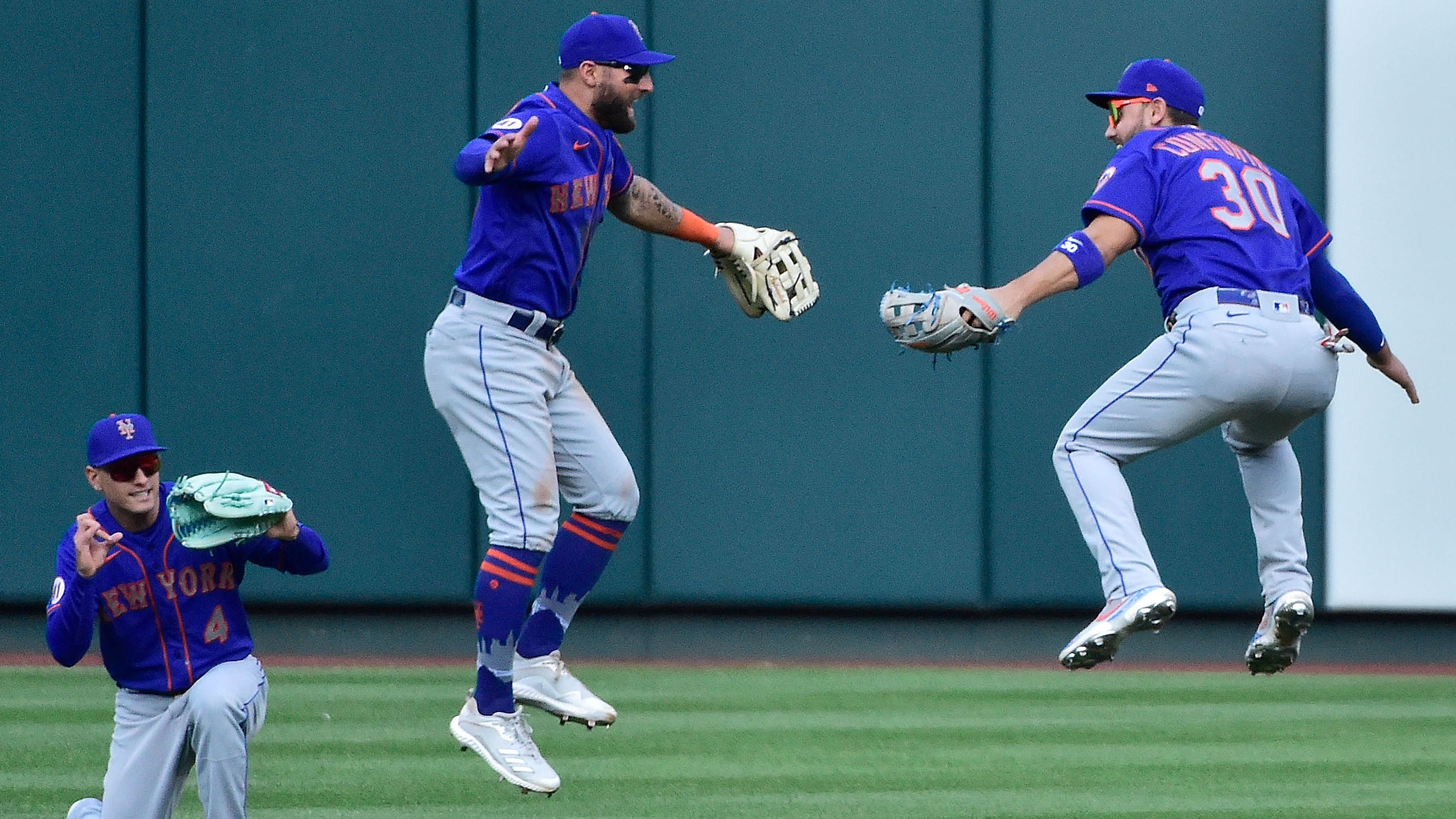 May 6, 2021; St. Louis, Missouri, USA; New York Mets center fielder Albert Almora Jr. (4) and center fielder Kevin Pillar (11) and right fielder Michael Conforto (30) celebrate after the Mets defeated the St. Louis Cardinals at Busch Stadium. / Jeff Curry-USA TODAY Sports
