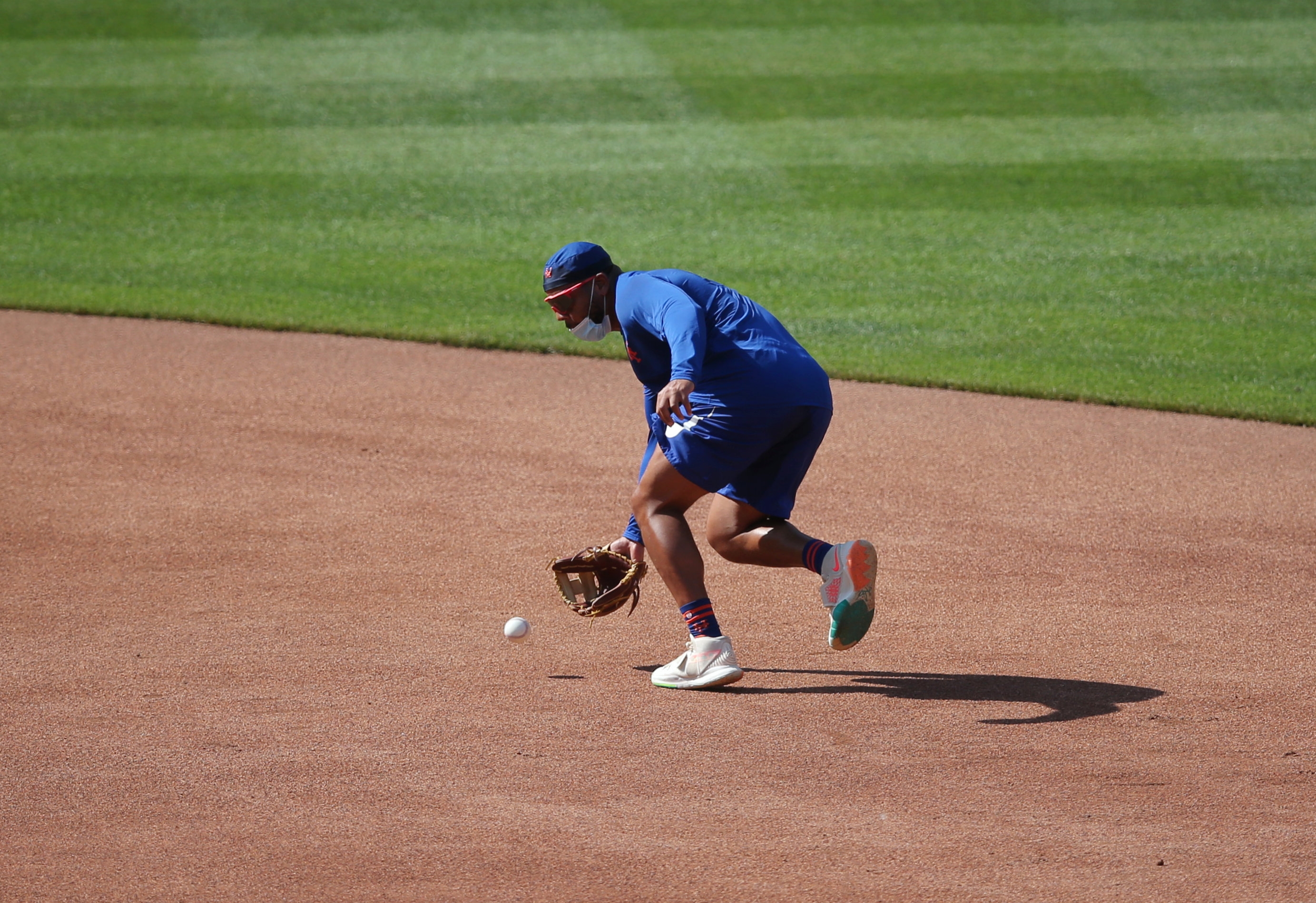 Jul 18, 2020; New York City, New York, USA; New York Mets first baseman Dominic Smith (2) fields ground balls during batting practice before a preseason game against the New York Yankees at Citi Field. Mandatory Credit: Brad Penner-USA TODAY Sports / Brad Penner-USA TODAY Sports