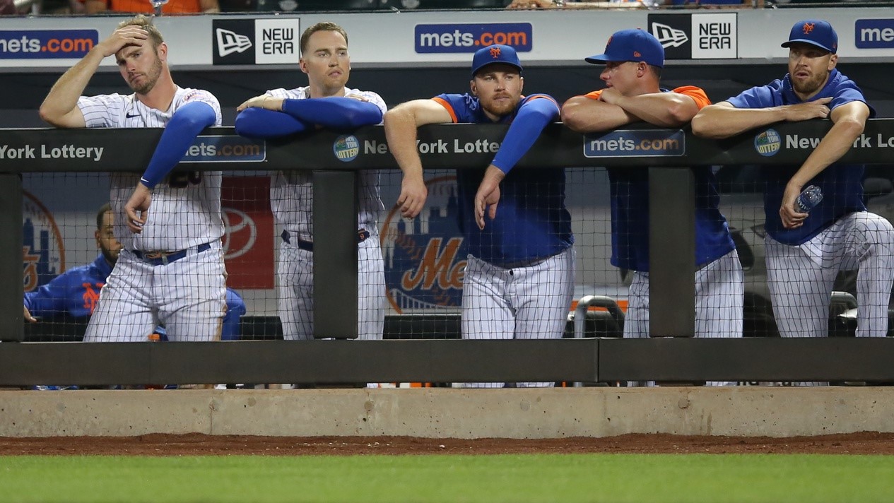 Aug 24, 2021; New York City, New York, USA; New York Mets first baseman Pete Alonso (left to right), center fielder Brandon Nimmo (9), infielder Brandon Drury (35), catcher James McCann (33) and injured starting pitcher Jacob deGrom (48) watch during the ninth inning against the San Francisco Giants at Citi Field. / Brad Penner-USA TODAY Sports