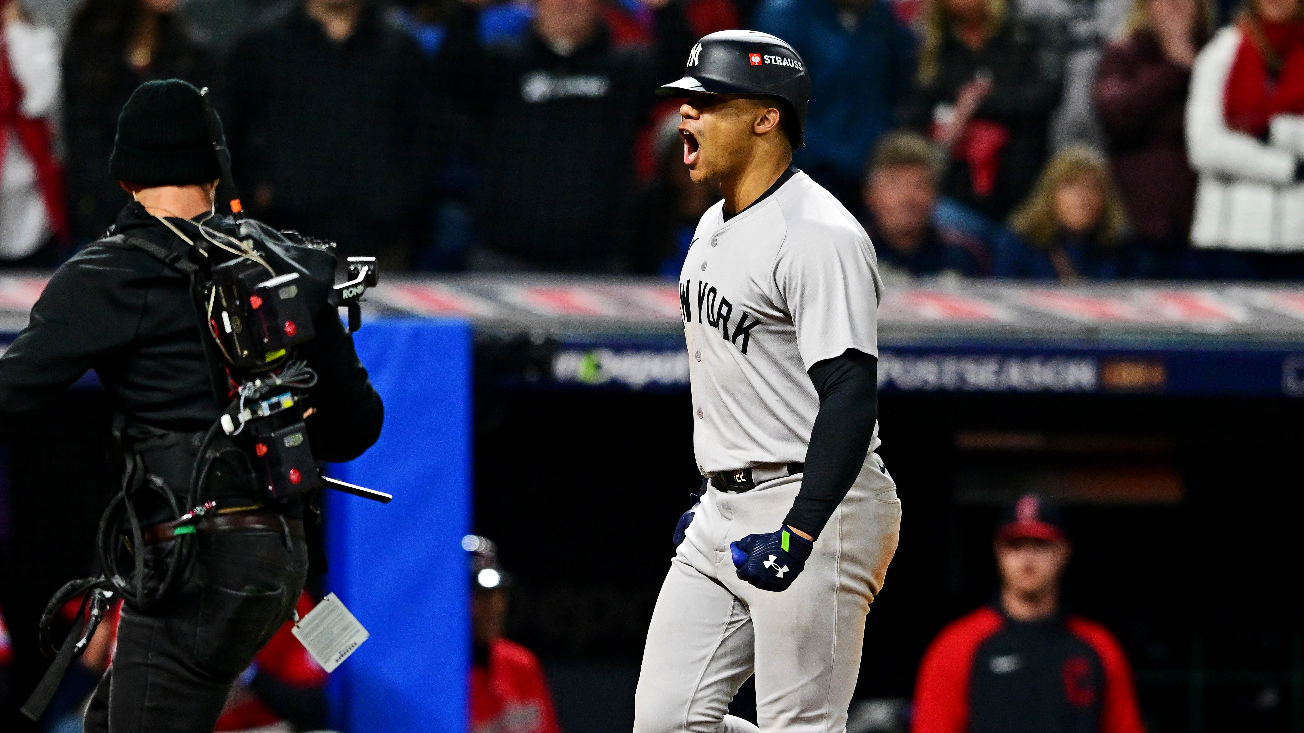 Oct 19, 2024; Cleveland, Ohio, USA; New York Yankees outfielder Juan Soto (22) celebrates after making the final out to beat the Cleveland Guardians during game five of the ALCS for the 2024 MLB playoffs at Progressive Field. / David Dermer-Imagn Images