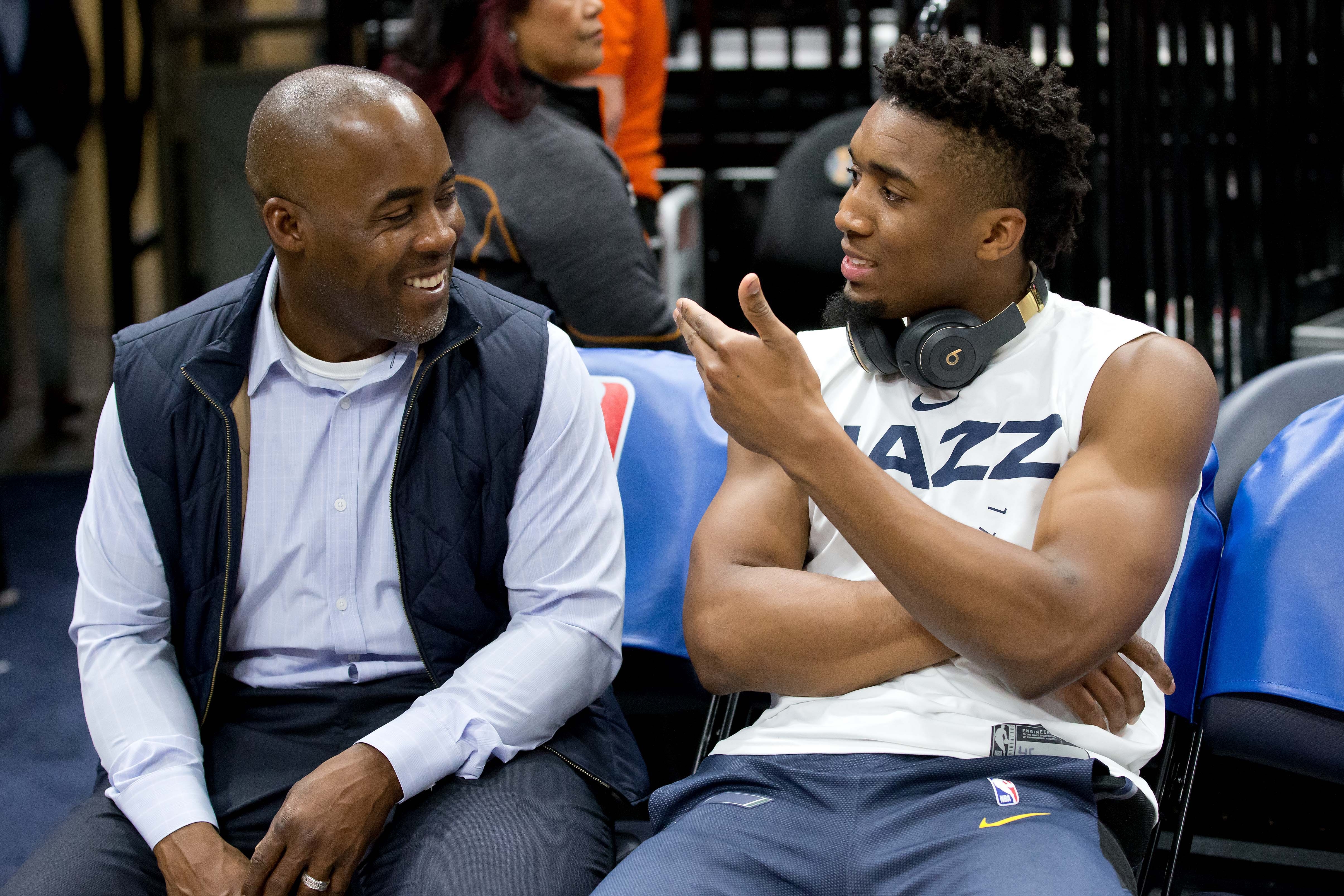 Oct 19, 2018; Salt Lake City, UT, USA; Utah Jazz guard Donovan Mitchell (right) talks with his father Donovan Mitchell Sr. prior to a game against the Golden State Warriors at Vivint Smart Home Arena. Mandatory Credit: Russ Isabella-USA TODAY Sports / Russell Isabella
