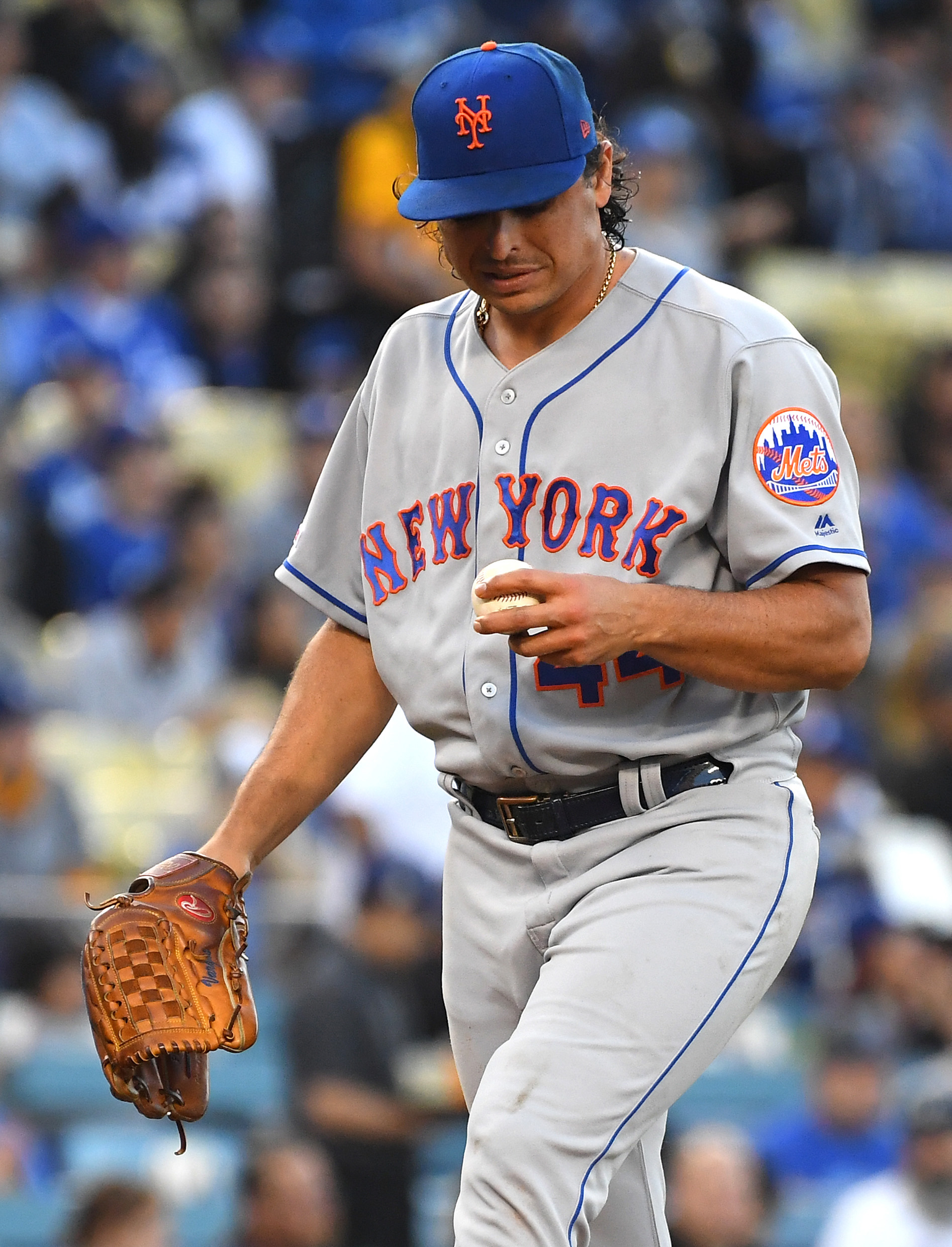 May 30, 2019; Los Angeles, CA, USA; New York Mets starting pitcher Jason Vargas (44) looks at the ball after giving up a run in the first inning of the game against the Los Angeles Dodgers at Dodger Stadium. Mandatory Credit: Jayne Kamin-Oncea-USA TODAY Sports / Jayne Kamin-Oncea