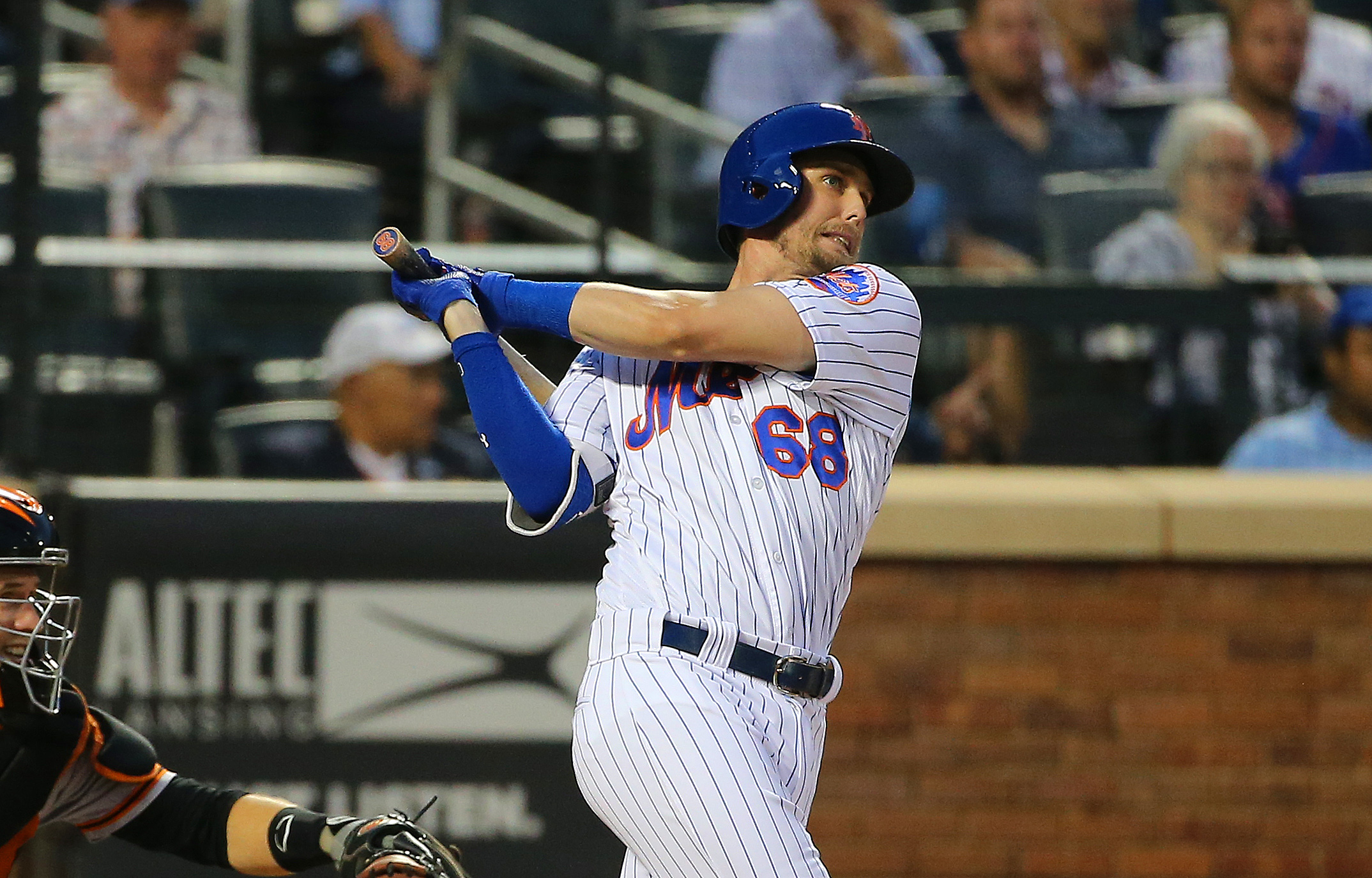 Aug 22, 2018; New York City, NY, USA; New York Mets second baseman Jeff McNeil (68) hits an RBI single against the San Francisco Giants during the second inning at Citi Field. Mandatory Credit: Andy Marlin-USA TODAY Sports / Andy Marlin
