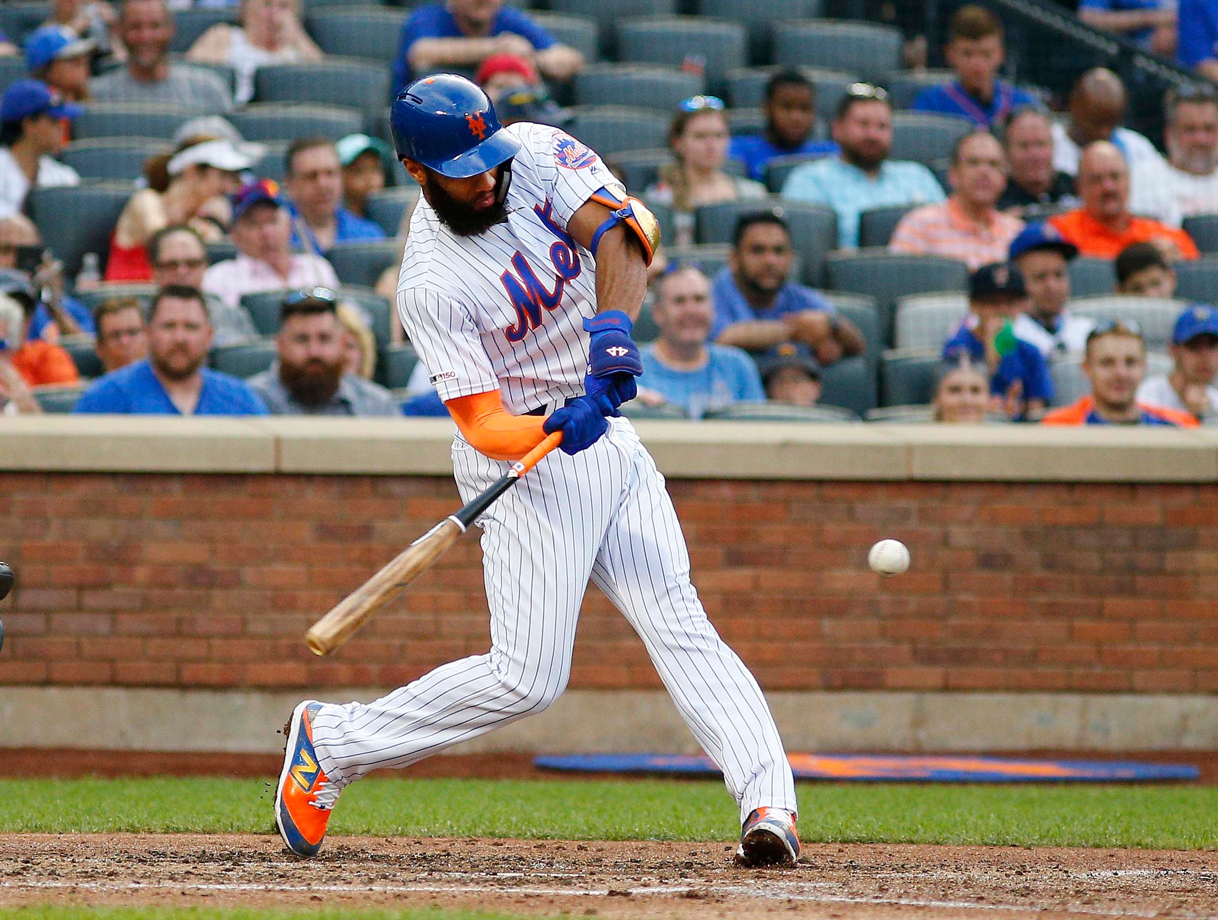 Jun 29, 2019; New York City, NY, USA; New York Mets shortstop Amed Rosario (1) doubles against the Atlanta Braves during the fourth inning at Citi Field. Mandatory Credit: Andy Marlin-USA TODAY Sports / Andy Marlin
