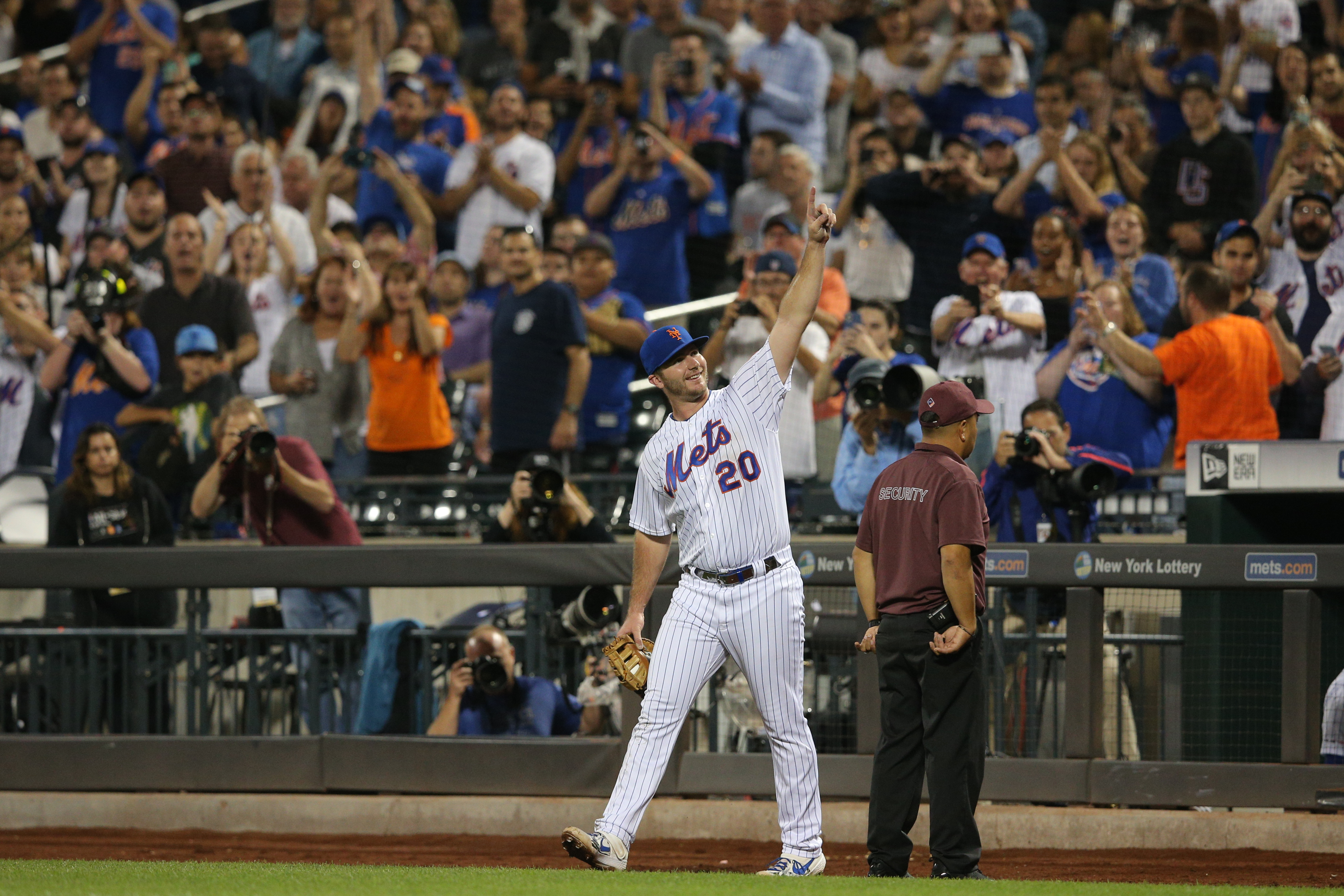 Sep 28, 2019; New York City, NY, USA; New York Mets first baseman Pete Alonso (20) celebrates his third inning solo home run against the Atlanta Braves as he comes onto the field for the fourth inning at Citi Field. The home run was his 53rd of the season breaking the rookie record for home runs in a single season. Mandatory Credit: Brad Penner-USA TODAY Sportsundefined