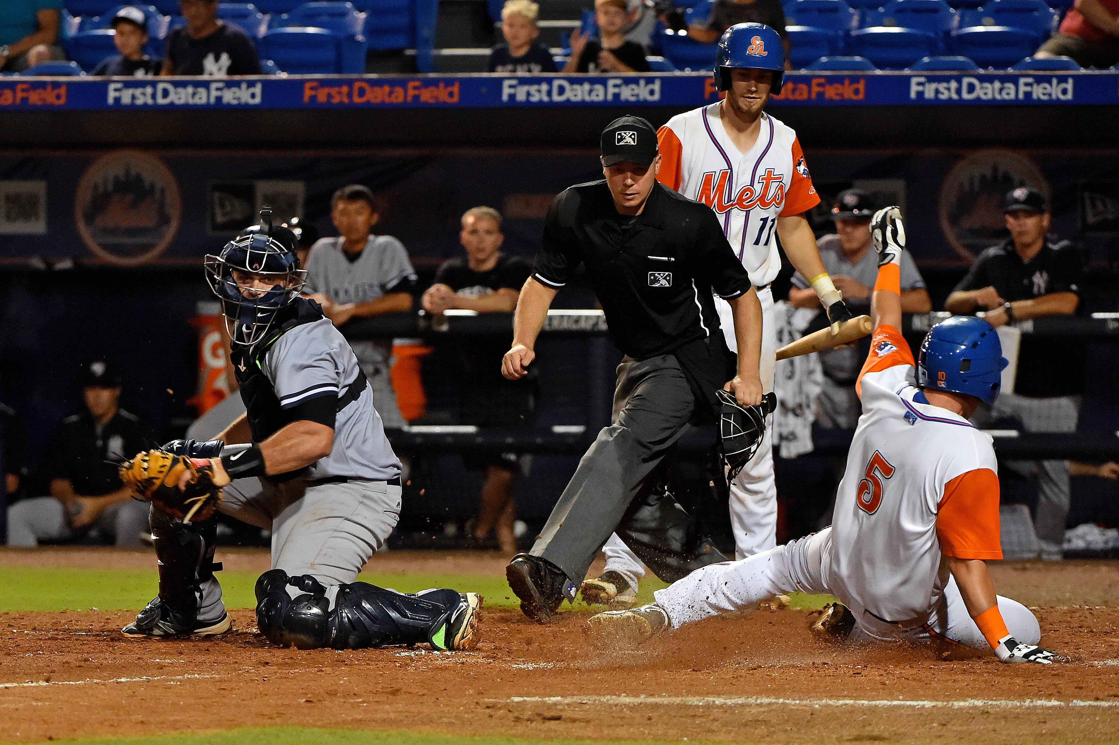 Aug 3, 2017; Port St. Lucie, FL, USA; St. Lucie Mets second baseman Jeff McNeil (5) scores before the tag of Tampa Yankees catcher Wes Wilson (69) in the eight inning at First Data Field. Mandatory Credit: Jasen Vinlove-USA TODAY Sports / Jasen Vinlove