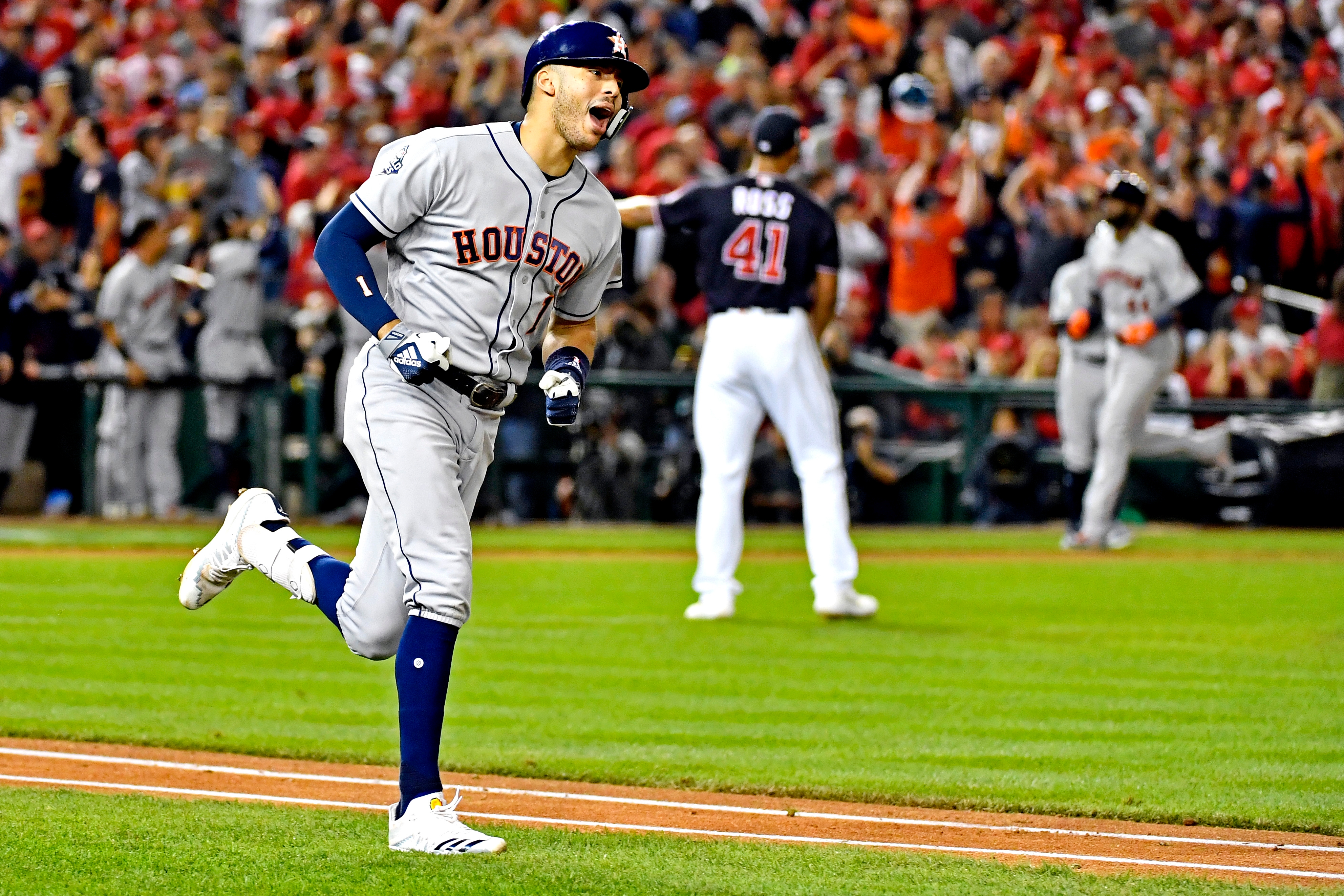 Oct 27, 2019; Washington, DC, USA; Houston Astros shortstop Carlos Correa (1) hits a two run home run during the fourth inning against the Washington Nationals in game five of the 2019 World Series at Nationals Park. Mandatory Credit: Brad Mills-USA TODAY Sports / Brad Mills