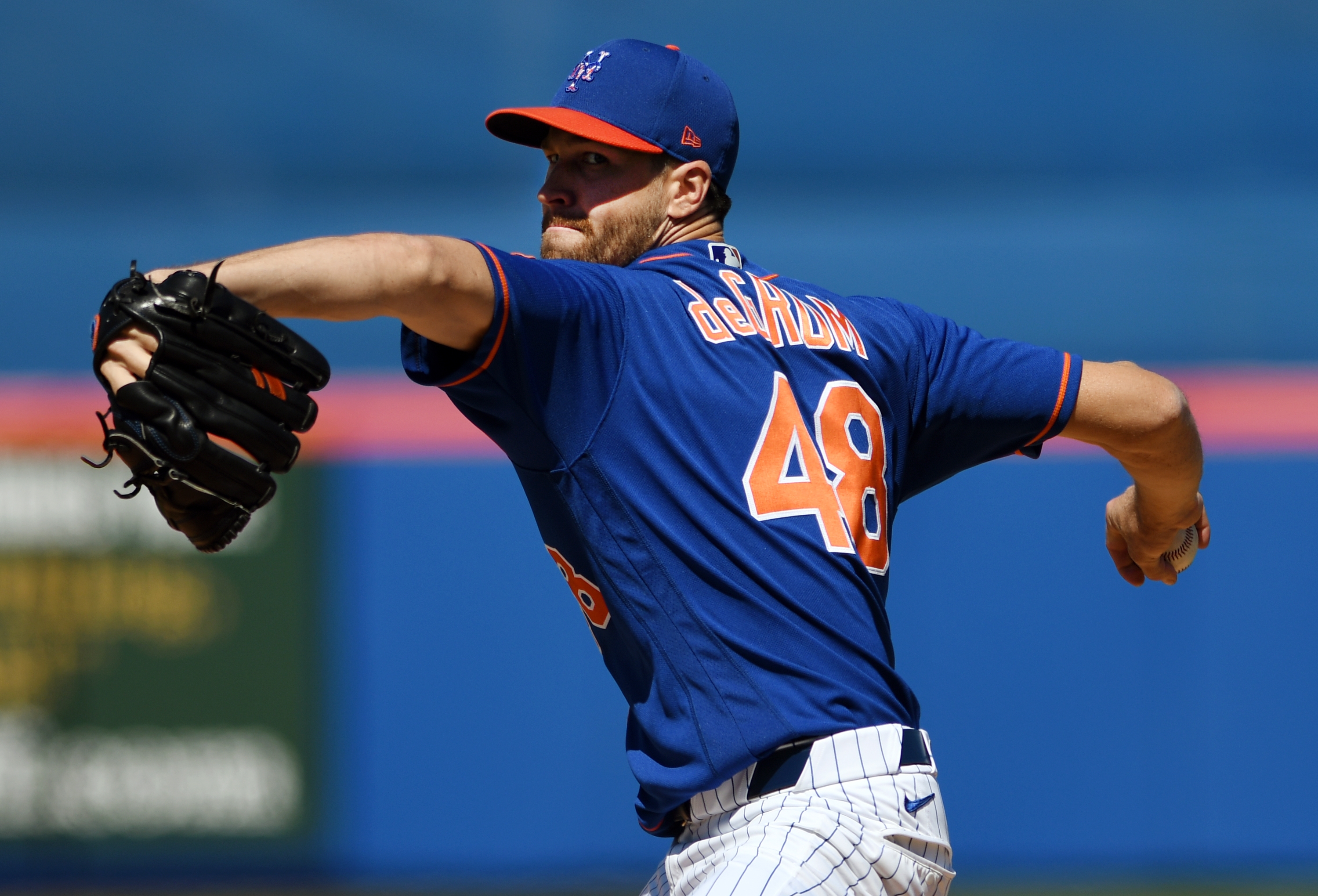 Mar 1, 2020; Port St. Lucie, Florida, USA; New York Mets pitcher Jacob deGrom (48) throws against the Washington Nationals at Clover Park. Mandatory Credit: Jim Rassol-USA TODAY Sports / Jim Rassol