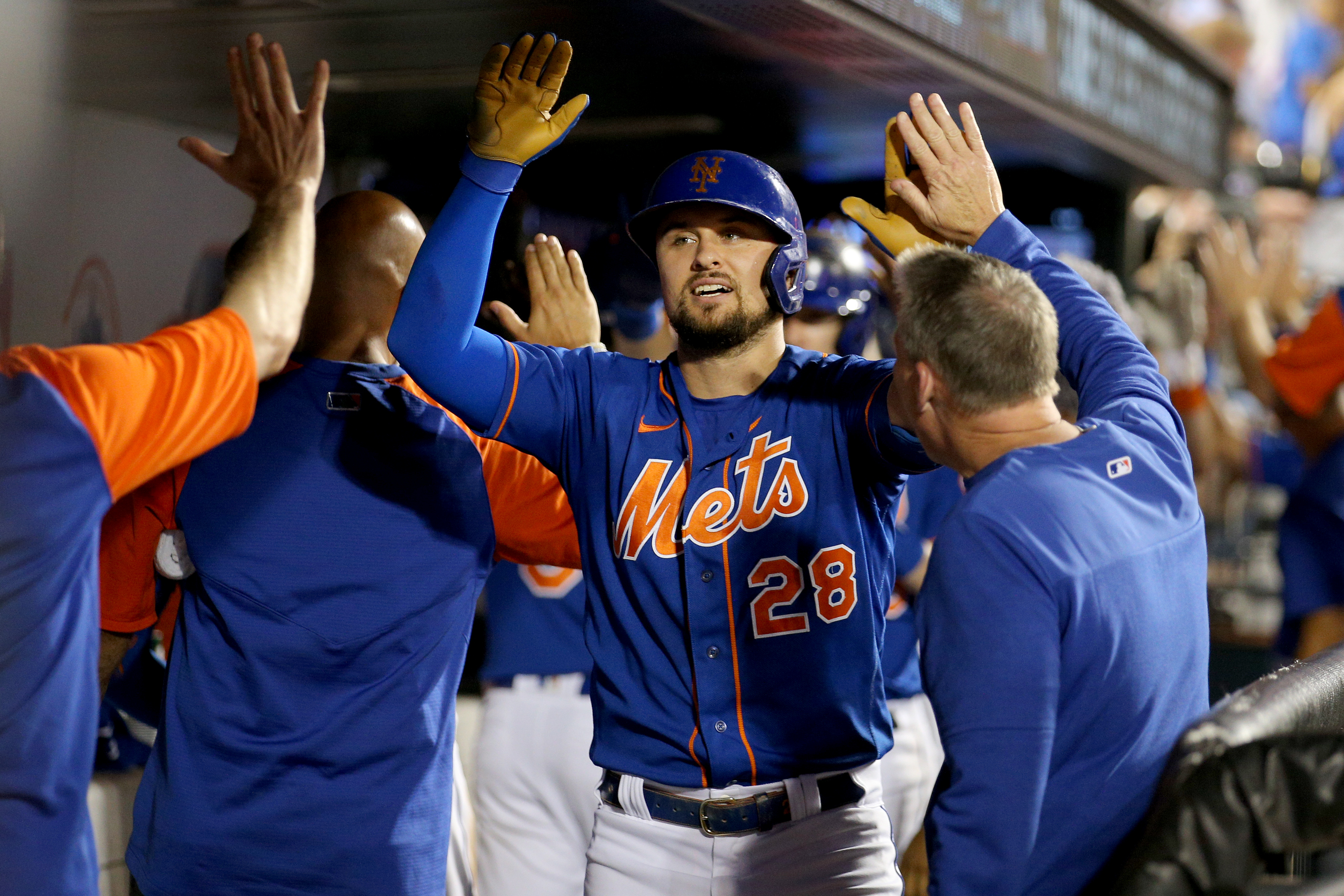 New York Mets designated hitter J.D. Davis (28) celebrates his grand slam against the Miami Marlins in the dugout with teammates during the fifth inning at Citi Field. / Brad Penner-USA TODAY Sports