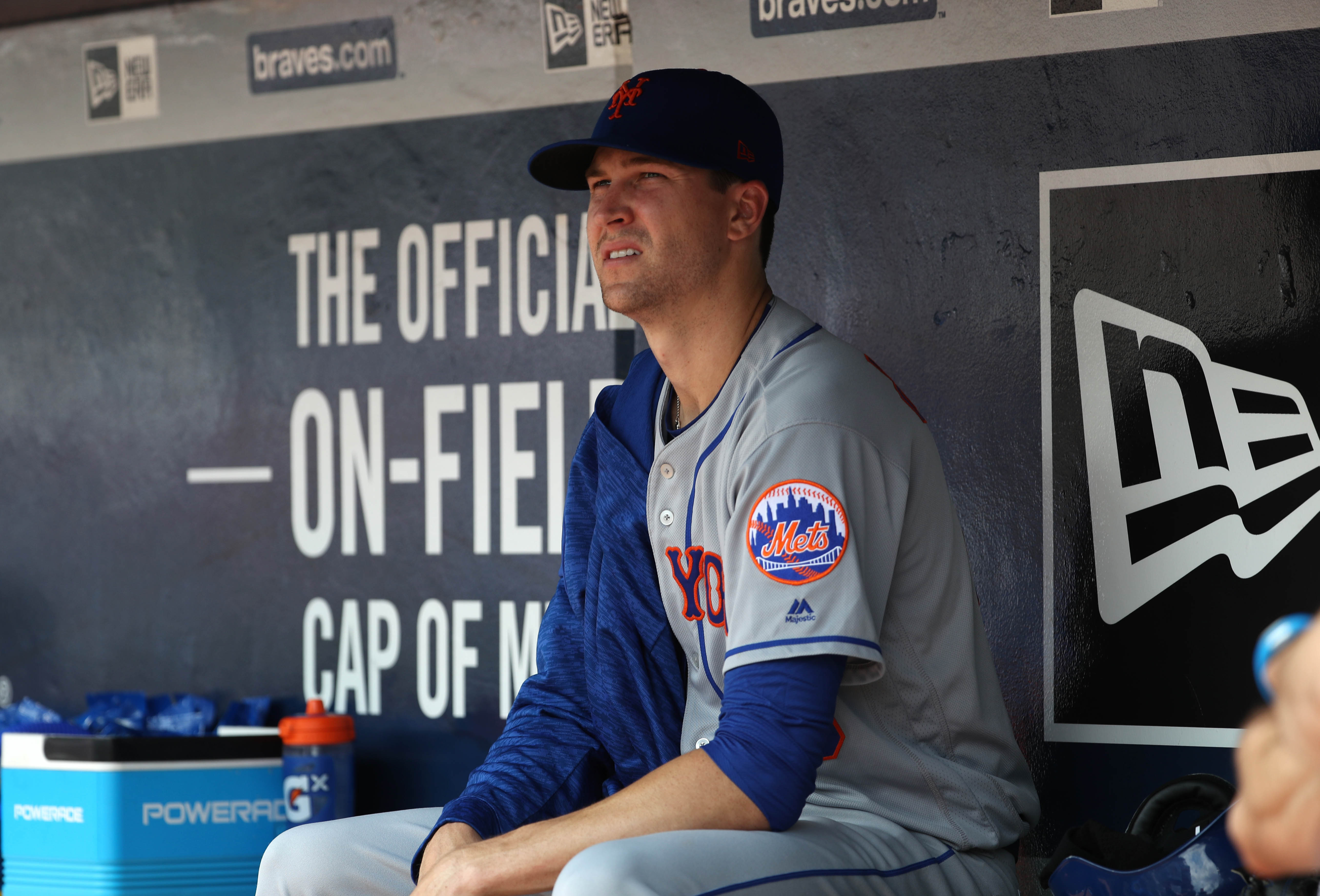 Jun 13, 2018; Atlanta, GA, USA; New York Mets starting pitcher Jacob deGrom (48) looks on from the dugout in the fourth inning against the Atlanta Braves at SunTrust Park. Mandatory Credit: Jason Getz-USA TODAY Sports / Jason Getz
