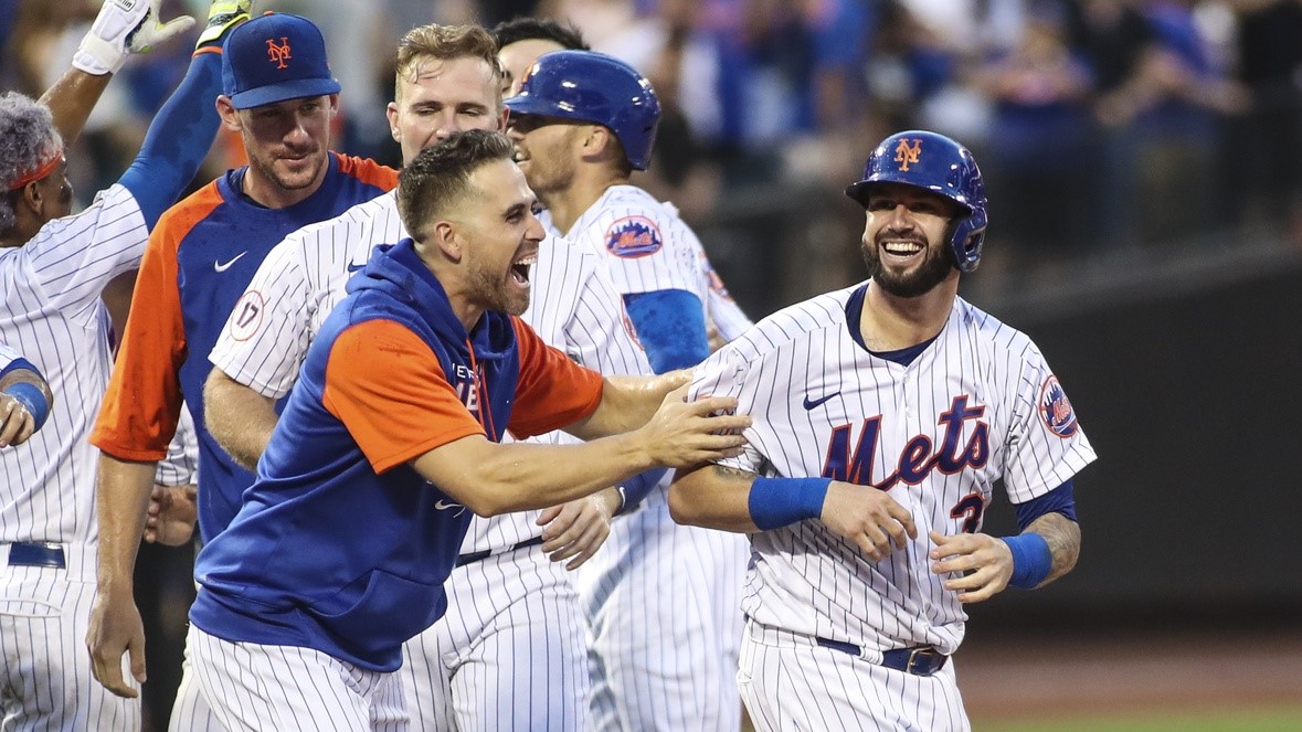 Jul 9, 2022; New York City, New York, USA; New York Mets outfielder Ender Inciarte (22) grabs catcher Tomas Nido (3) after he scored the winning run against the Miami Marlins at Citi Field / Wendell Cruz-USA TODAY Sports