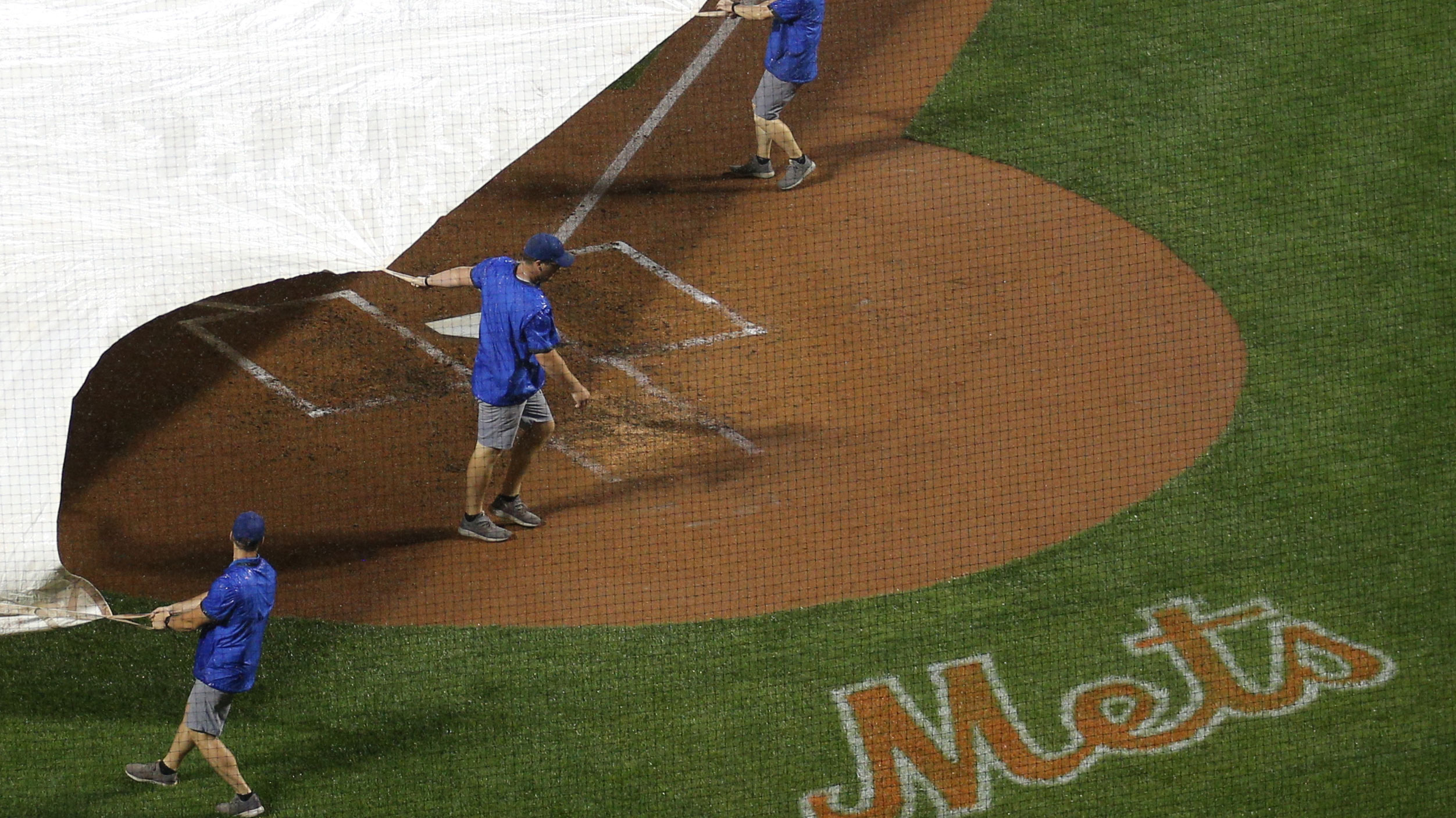 Aug 10, 2021; New York City, New York, USA; Members of the grounds crew roll the tarp onto the infield during a thunderstorm in the second inning of a game between the New York Mets and the Washington Nationals at Citi Field. / Brad Penner-USA TODAY Sports