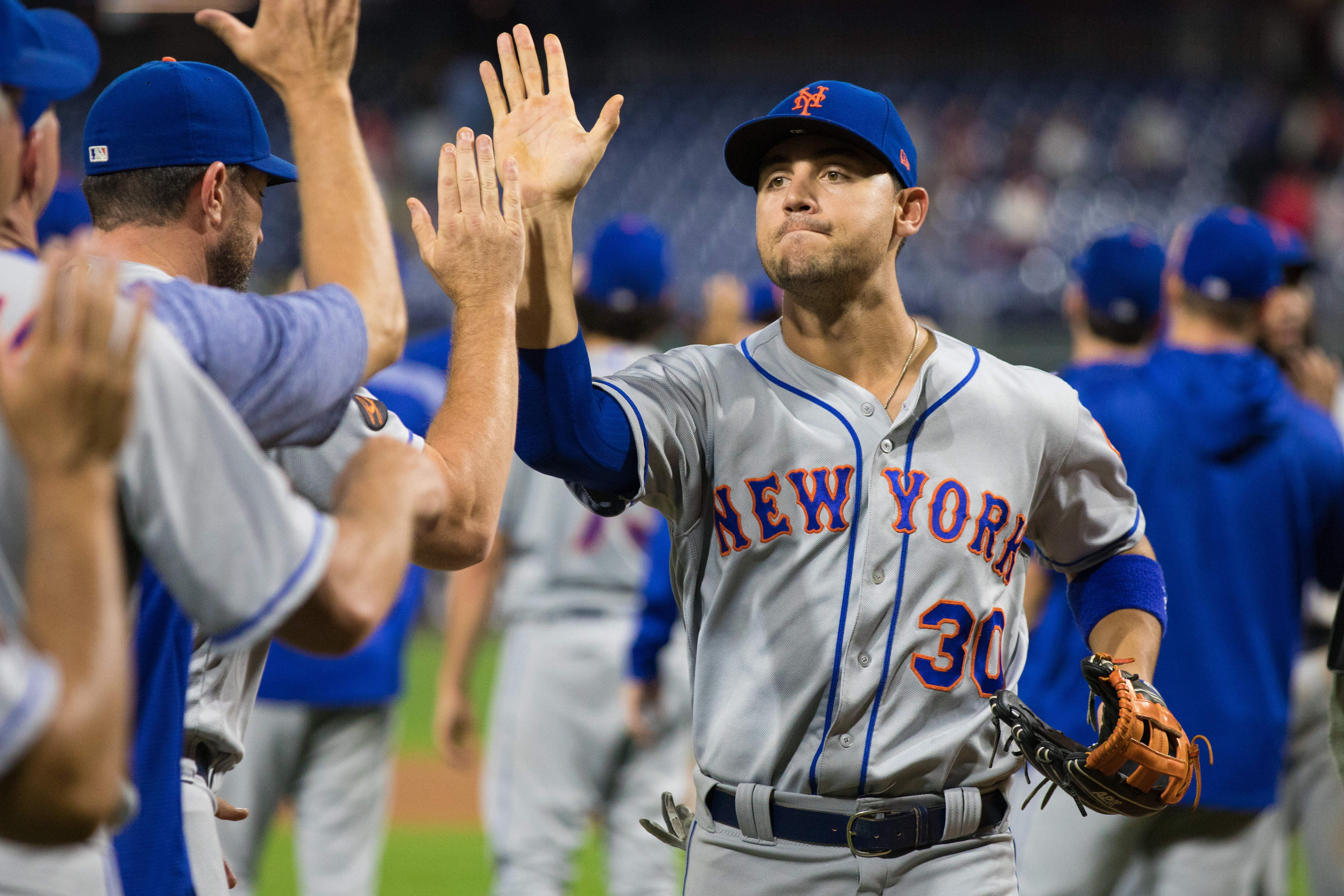 Sep 17, 2018; Philadelphia, PA, USA; New York Mets left fielder Michael Conforto (30) leads the high five line after a victory against the Philadelphia Phillies at Citizens Bank Park. Mandatory Credit: Bill Streicher-USA TODAY Sports / Bill Streicher