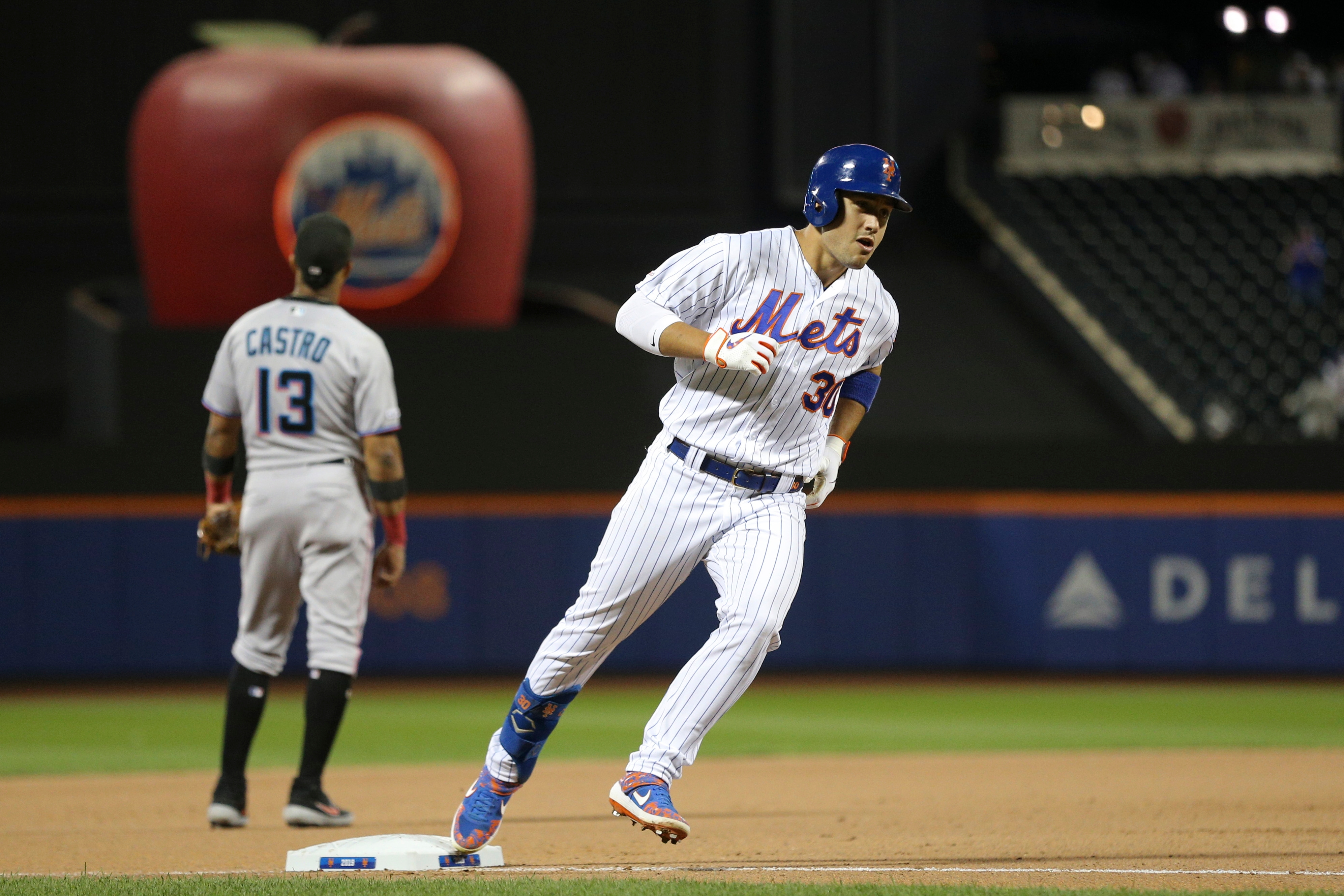 Sep 24, 2019; New York City, NY, USA; New York Mets right fielder Michael Conforto (30) rounds third base in front of Miami Marlins third baseman Starlin Castro (13) after hitting a two run home run against the Miami Marlins during the seventh inning at Citi Field. Mandatory Credit: Brad Penner-USA TODAY Sports / Brad Penner