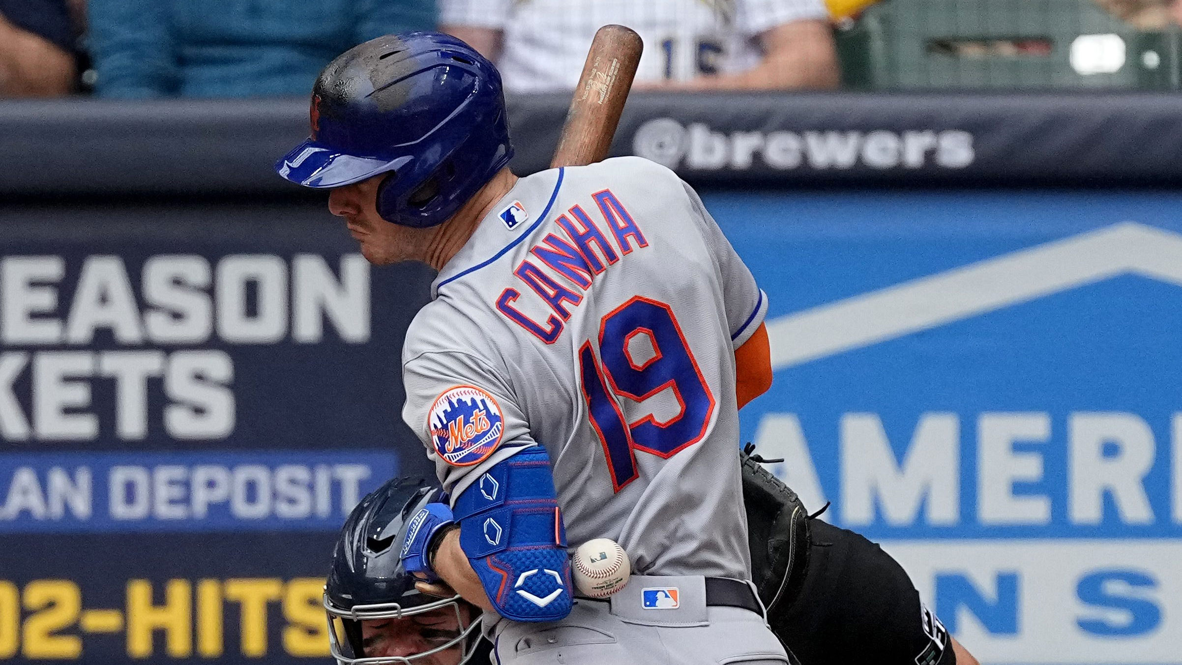 New York Mets left fielder Mark Canha (19) is hit by a pitch thrown by Milwaukee Brewers starting pitcher Adrian Houser during the fifth inning of their game Wednesday, September 21, 2022 at American Family Field in Milwaukee, Wis / MARK HOFFMAN/MILWAUKEE JOURNAL SENTINEL / USA TODAY NETWORK