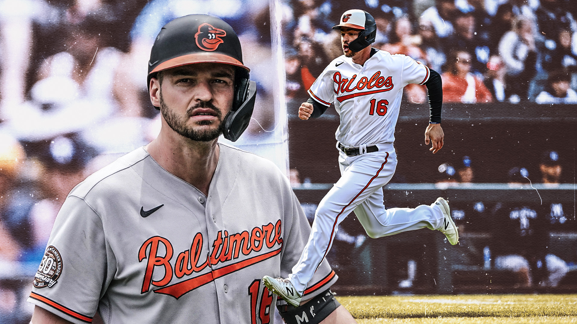 Jun 7, 2022; Baltimore, Maryland, USA; Baltimore Orioles designated hitter Trey Mancini (16) and right fielder Anthony Santander (25) bump arms to celebrate his home run against the Chicago Cubs during the first inning at Oriole Park at Camden Yards. / Gregory Fisher-USA TODAY Sports