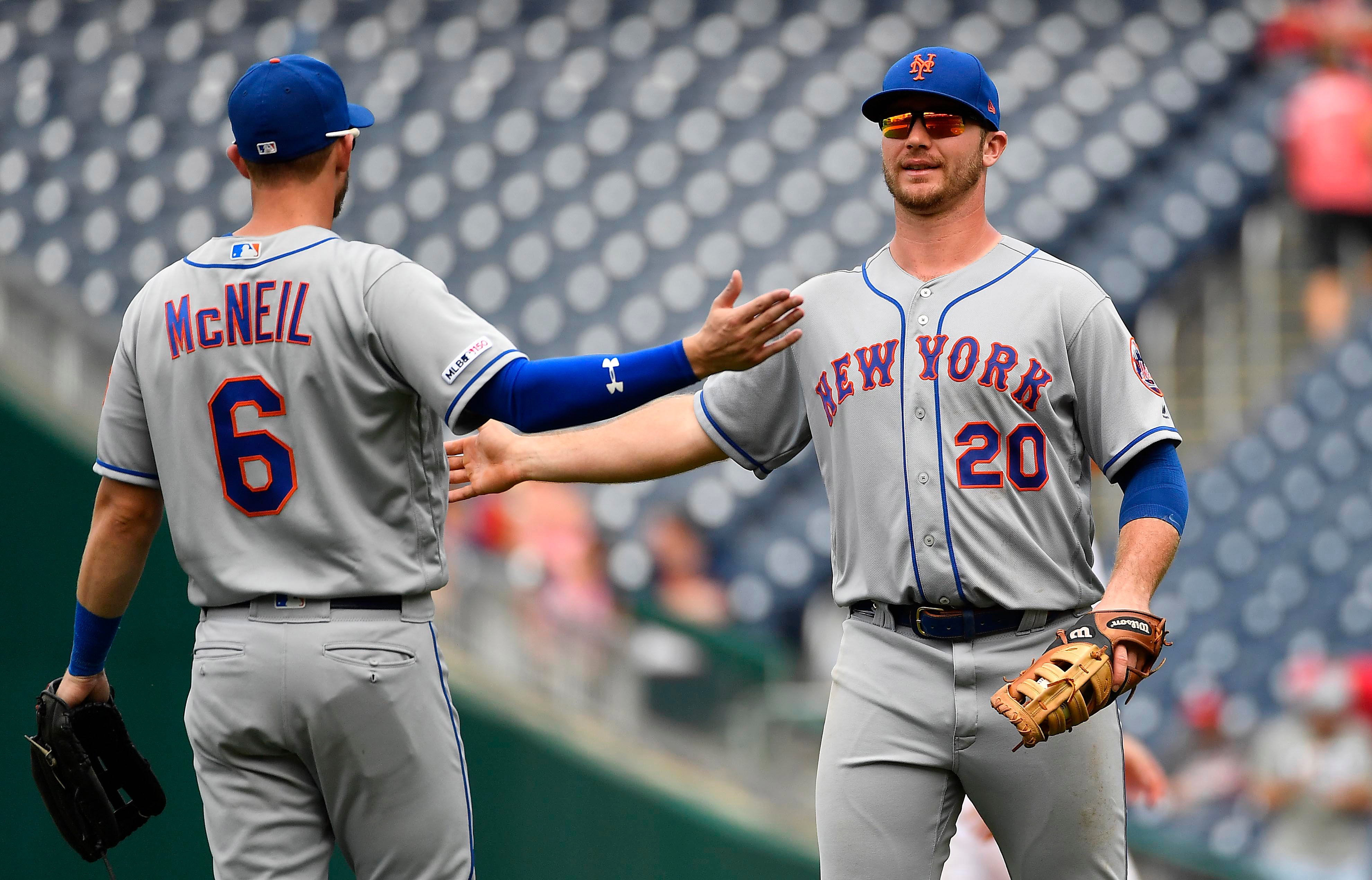 Sep 4, 2019; Washington, DC, USA; New York Mets first baseman Pete Alonso (20) and left fielder Jeff McNeil (6) celebrate after the game against the Washington Nationals at Nationals Park. Mandatory Credit: Brad Mills-USA TODAY Sports / Brad Mills