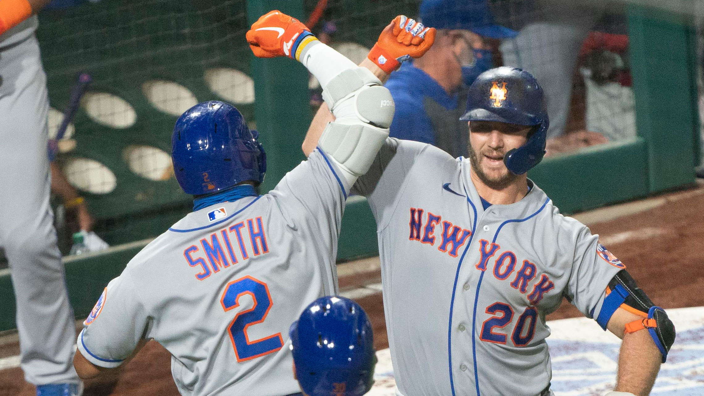 Aug 15, 2020; Philadelphia, Pennsylvania, USA; New York Mets first baseman Pete Alonso (20) congratulates New York Mets left fielder Dominic Smith (2) for hitting a two run home run during the ninth inning against the Philadelphia Phillies at Citizens Bank Park. / Gregory Fisher-USA TODAY Sports