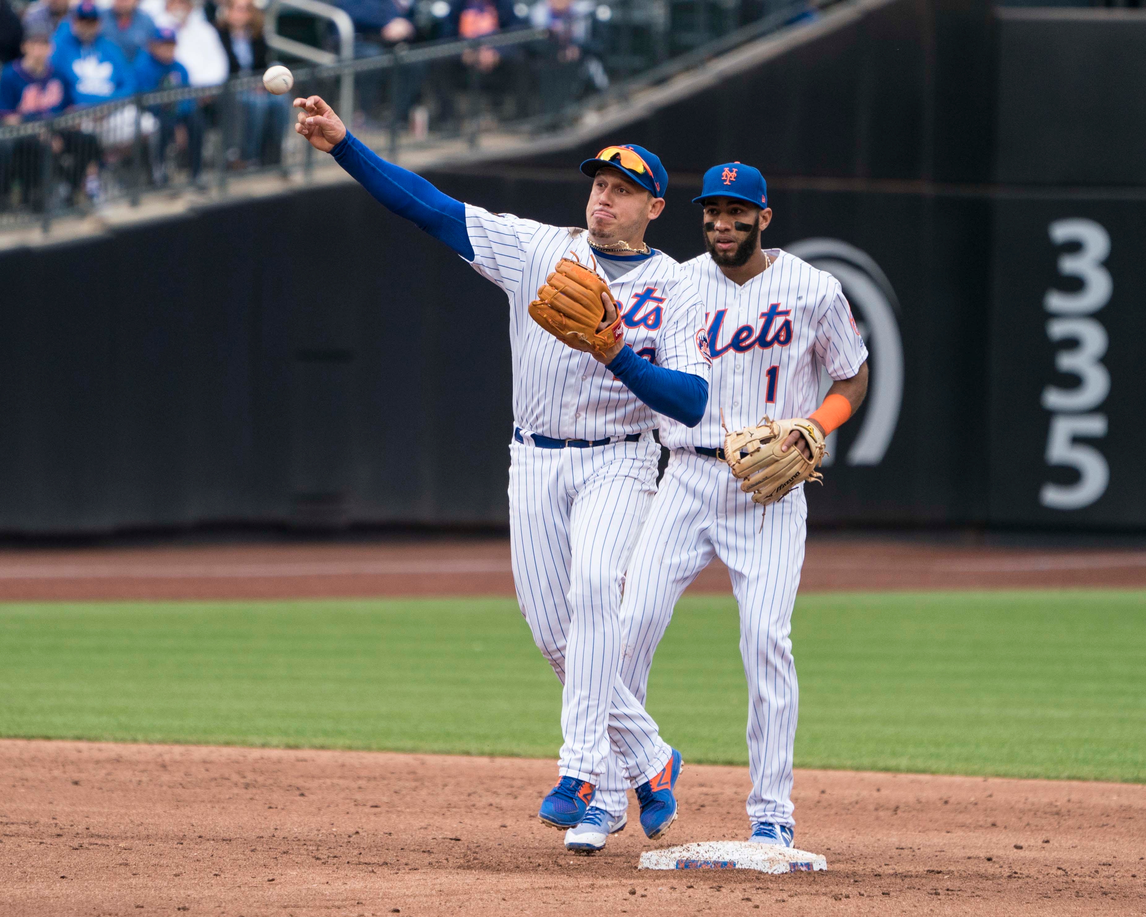 May 6, 2018; New York City, NY, USA; New York Mets second baseman Asdrubal Cabrera (13) turns a double play against the Colorado Rockies during the third inning of the game at Citi Field. Mandatory Credit: Gregory J. Fisher-USA TODAY Sports / Gregory Fisher