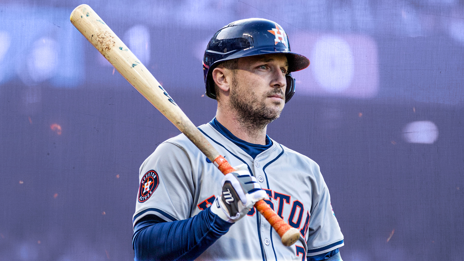 Houston Astros third baseman Alex Bregman (2) hits a single against the Los Angeles Angels during the seventh inning at Angel Stadium. / Gary A. Vasquez - Imagn Images