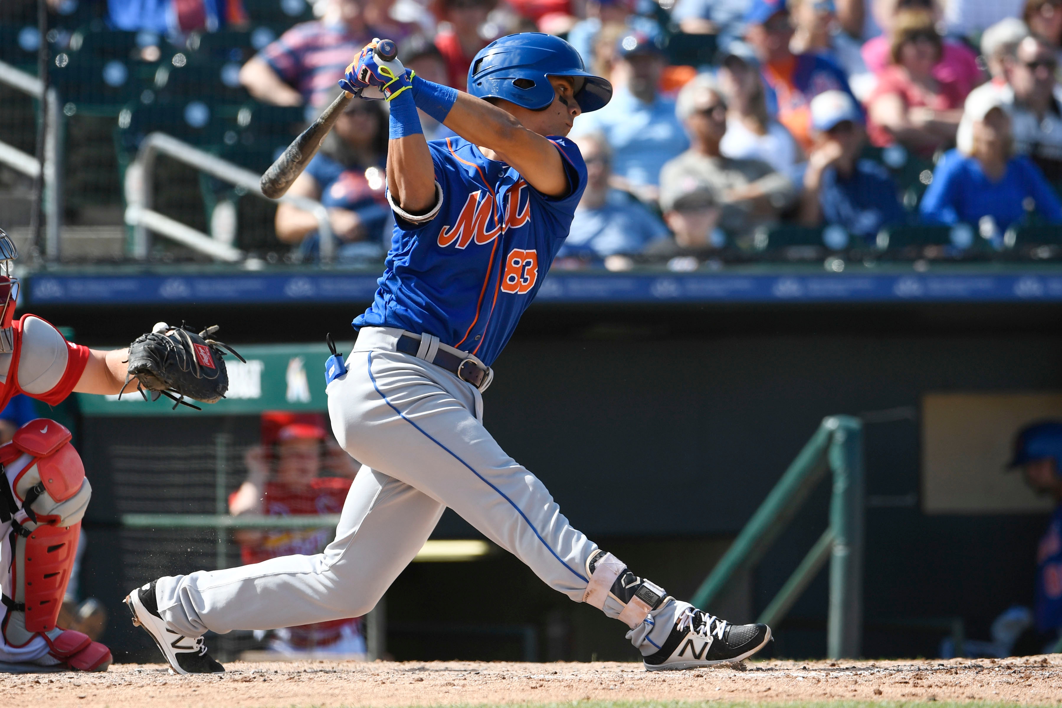 Mar 18, 2017; Jupiter, FL, USA; New York Mets shortstop Andres Gimenez (83) connects for a base hit against the St. Louis Cardinals during a spring training game at Roger Dean Stadium. The Mets defeated the Cardinals 5-4. Mandatory Credit: Scott Rovak-USA TODAY Sports / Scott Rovak
