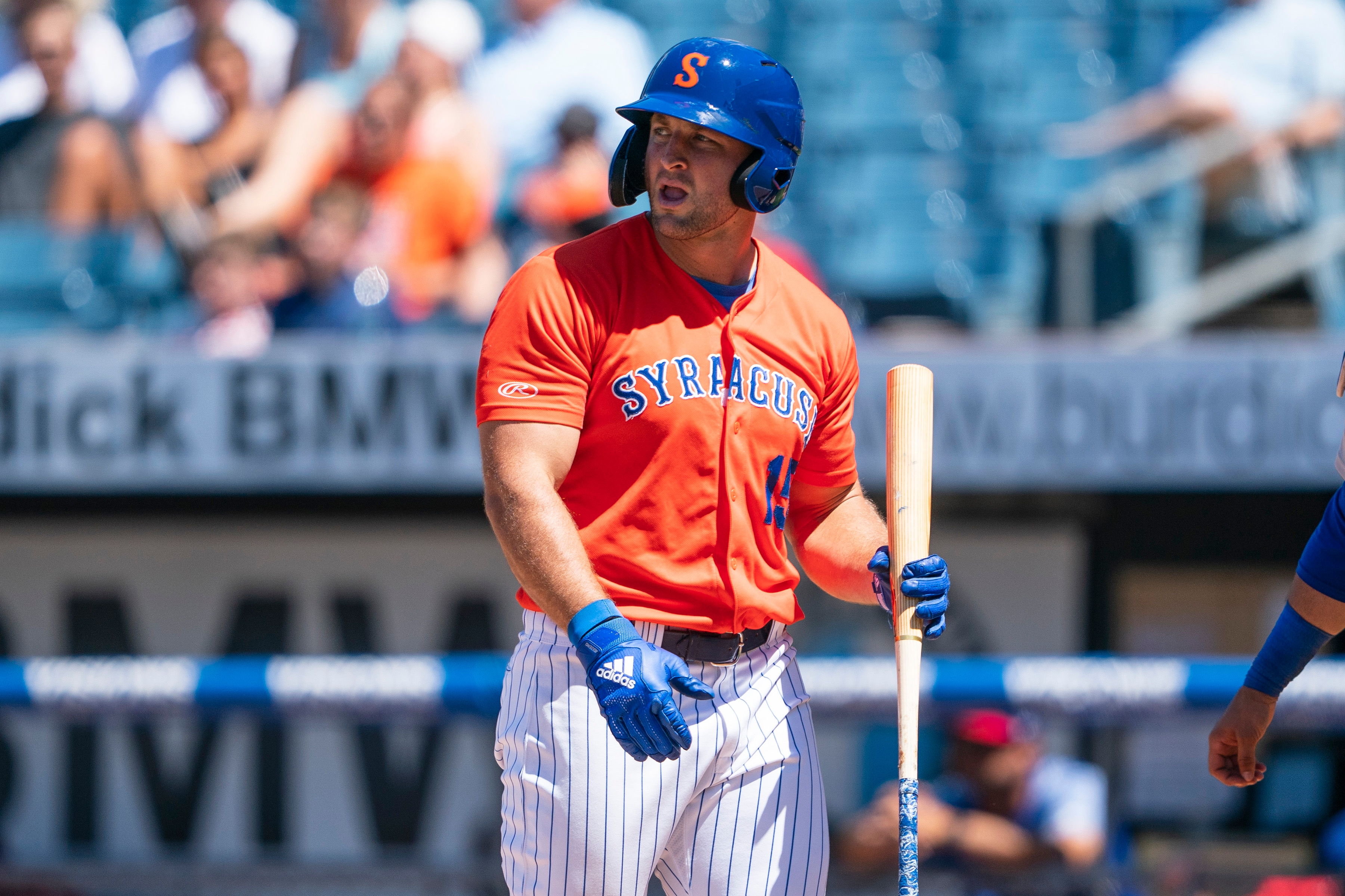 Syracuse Mets left fielder Tim Tebow reacts after striking out during the fourth inning against the Buffalo Bisons at NBT Bank Stadium. / Gregory Fisher/USA TODAY Sports