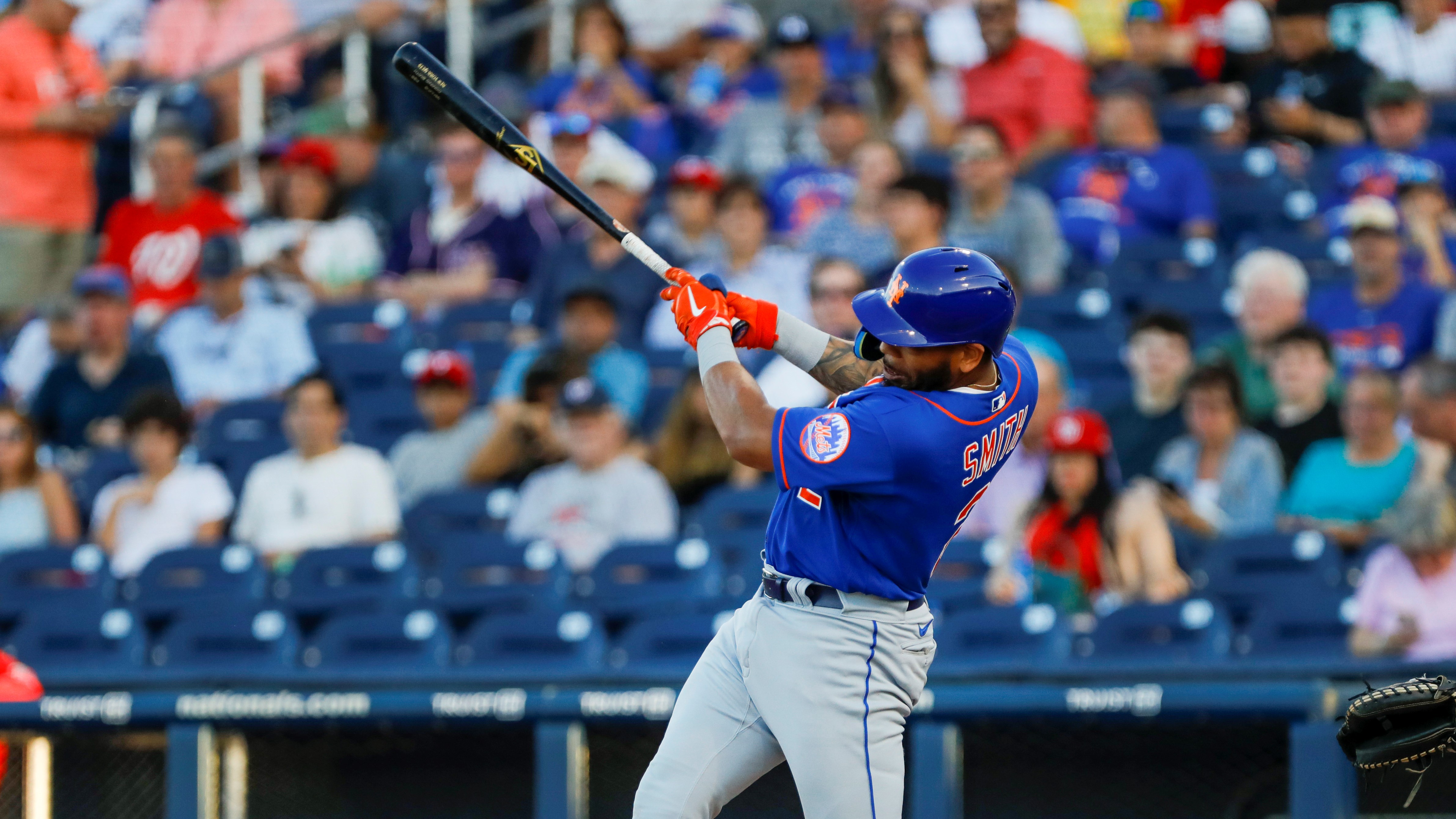 Mar 19, 2022; West Palm Beach, Florida, USA; New York Mets left fielder Dominic Smith (2) connects for a triple in the third inning of the game against the Washington Nationals during spring training at The Ballpark of the Palm Beaches. Mandatory Credit: Sam Navarro-USA TODAY Sports / Sam Navarro-USA TODAY Sports