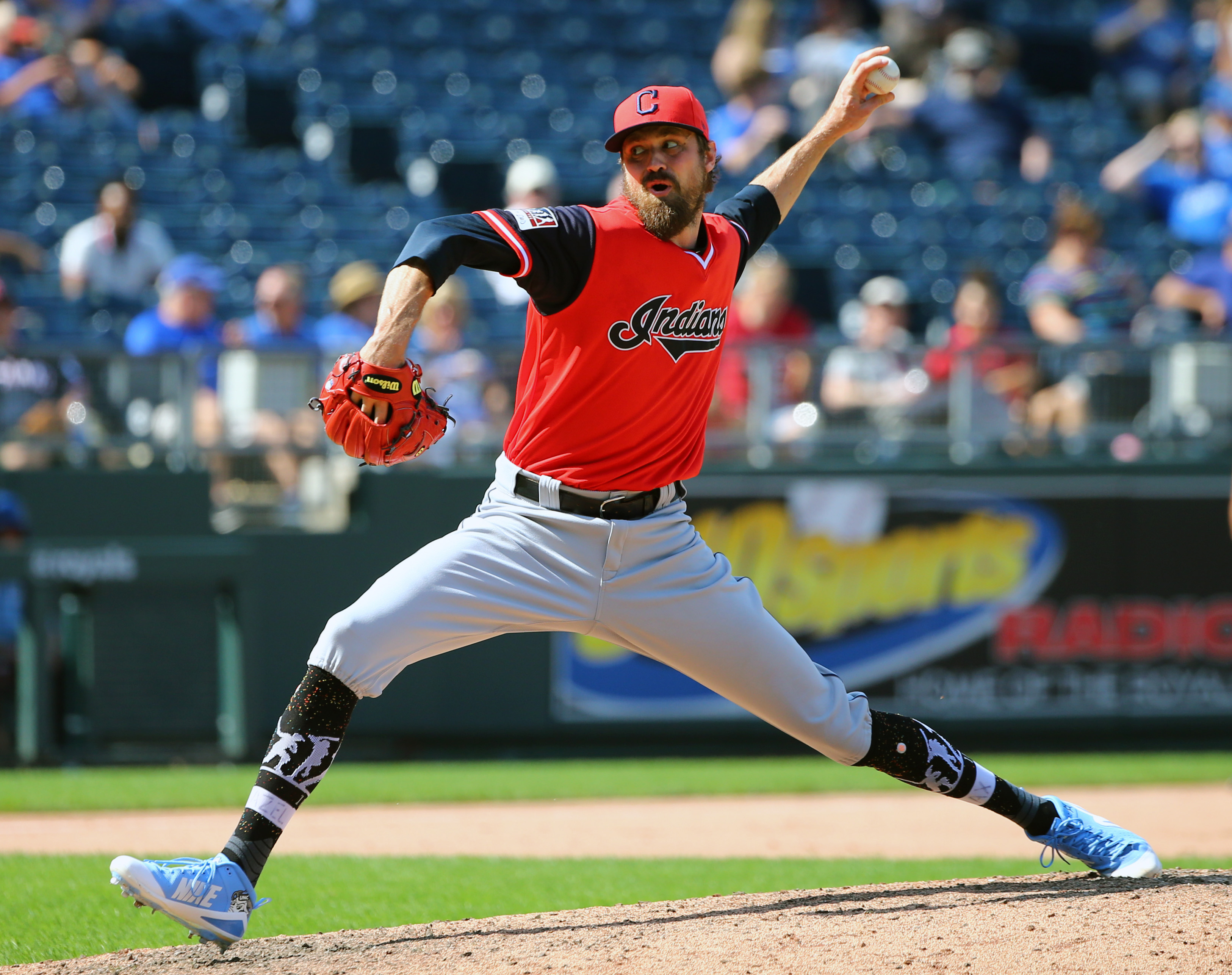 Cleveland Indians relief pitcher Andrew Miller pitches against the Kansas City Royals in the eighth inning at Kauffman Stadium. / Jay Biggerstaff/USA TODAY Sports