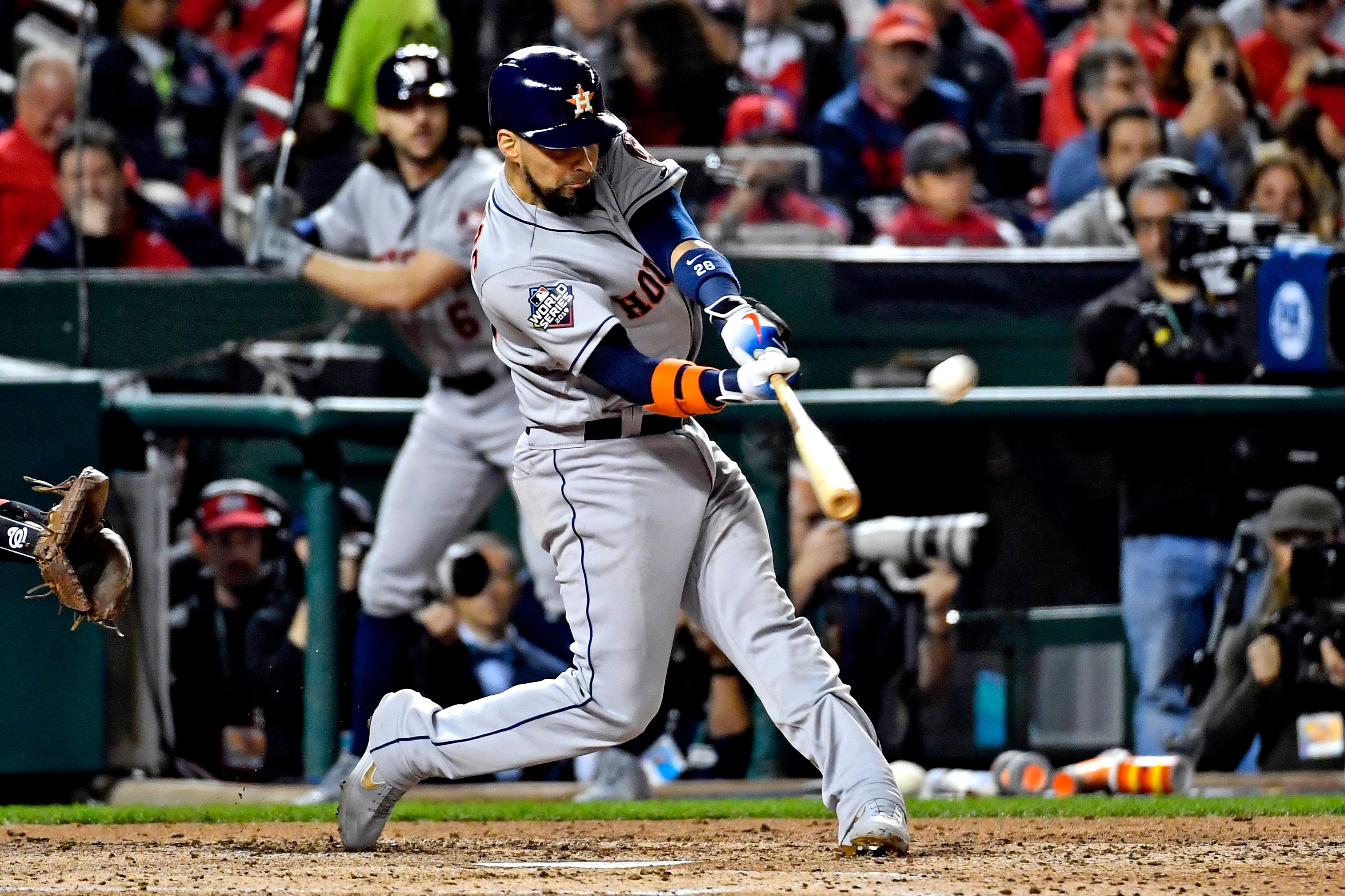 Oct 26, 2019; Washington, DC, USA; Houston Astros catcher Robinson Chirinos (28) hits a two run home run during the fourth inning against the Washington Nationals in game four of the 2019 World Series at Nationals Park. Mandatory Credit: Brad Mills-USA TODAY Sports / Brad Mills