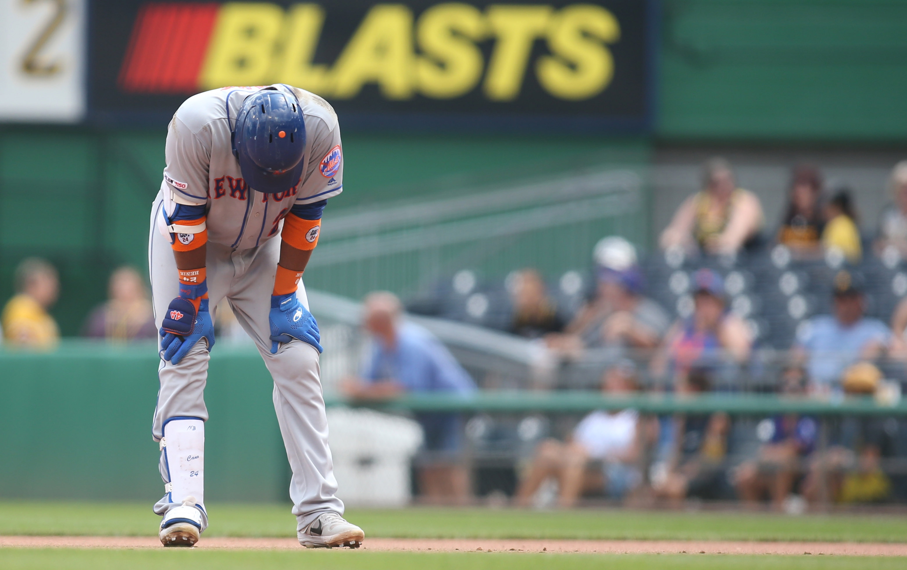Aug 4, 2019; Pittsburgh, PA, USA; New York Mets second baseman Robinson Cano (24) reacts after suffering an apparent hamstring injury running the bases against the Pittsburgh Pirates during the fourth inning at PNC Park. Mandatory Credit: Charles LeClaire-USA TODAY Sports / Charles LeClaire