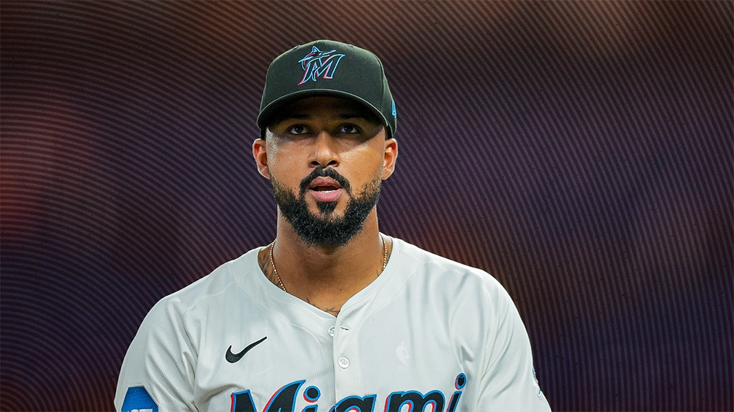 Mar 27, 2025; Miami, Florida, USA; Miami Marlins starting pitcher Sandy Alcantara (22) looks on against the Pittsburgh Pirates during the first inning at loanDepot Park. / Sam Navarro-Imagn Images