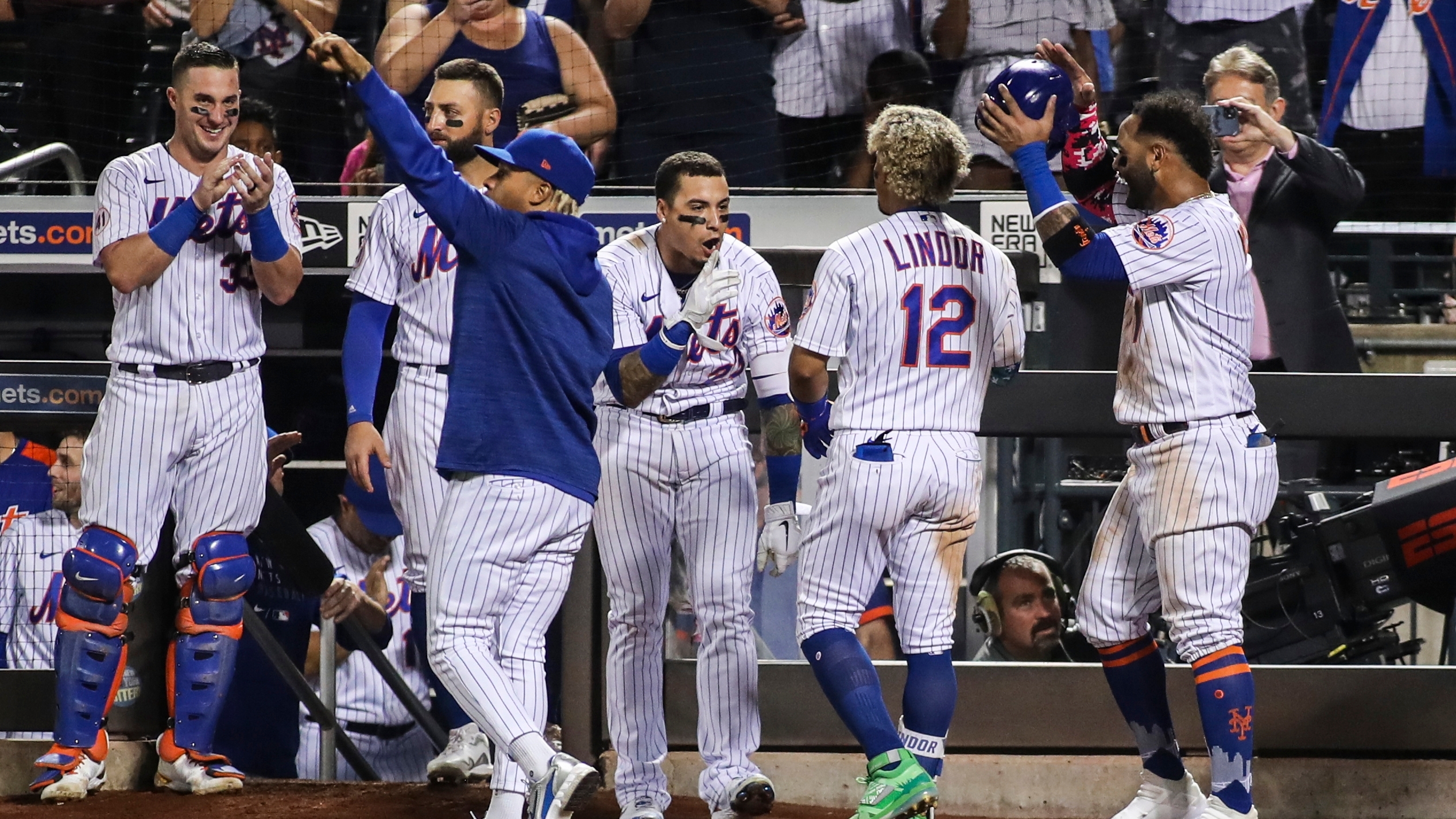 Sep 12, 2021; New York City, New York, USA; New York Mets shortstop Francisco Lindor (12) is greeted by his teammates after hitting his third home run of the game in the eighth inning against the New York Yankees at Citi Field. / Wendell Cruz-USA TODAY Sports